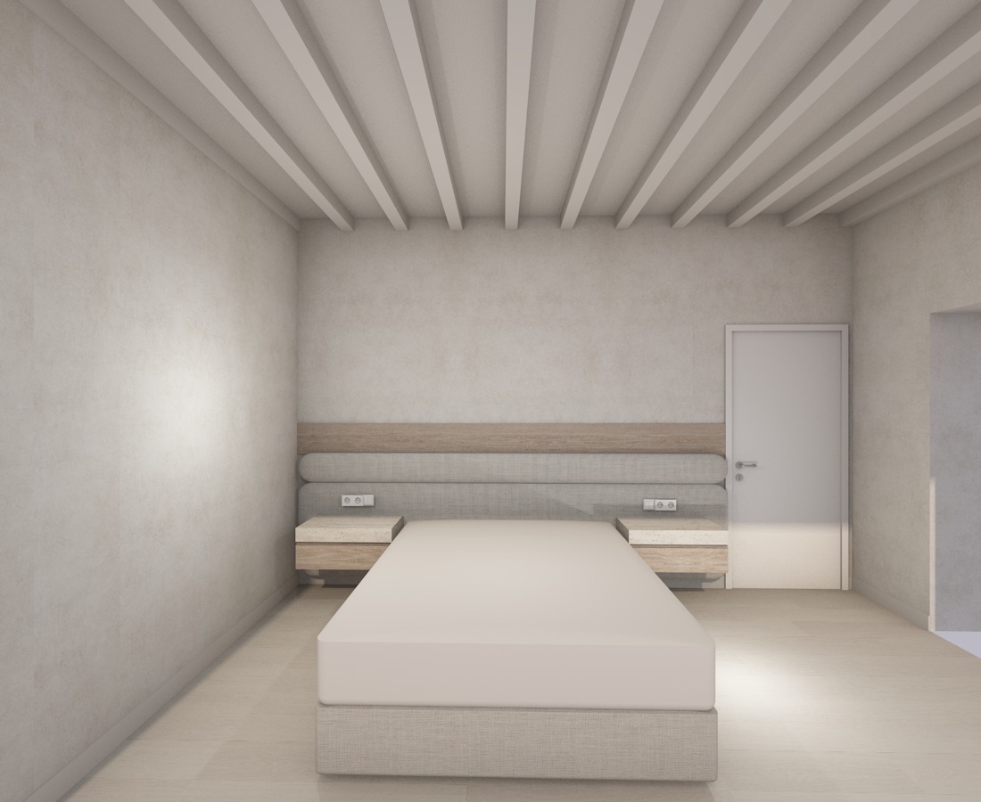 create a highly realistic render of a minimal bedroom with a calm and serene atmosphere the space feels soft warm and harmonious with a refined and natural aesthetic the bed is centered in the room featuring a fully upholstered base in a light beige fabric with a soft linen texture the headboard is designed as a layered composition it consists of two horizontal upholstered elements in soft beige tones with rounded edges creating a smooth and continuous form above them there is a slim horizontal light oak wood panel that runs across the wall adding a subtle contrast on both sides of the bed there are floating bedside tables with a minimal design they combine light wood elements with a stone surface on top maintaining a clean and balanced look the walls are finished in a light beige microcement creating a seamless and soft background the ceiling features exposed beams painted in an off white tone adding rhythm and architectural depth to the space on the right side there is a simple door in a light neutral color blending with the overall palette the flooring is in a light natural tone enhancing the calm and minimal atmosphere the space is illuminated softly with a diffused and even light creating minimal shadows and a peaceful ambiance ultra realistic render high resolution interior design magazine photography style ultra clear realistic textures