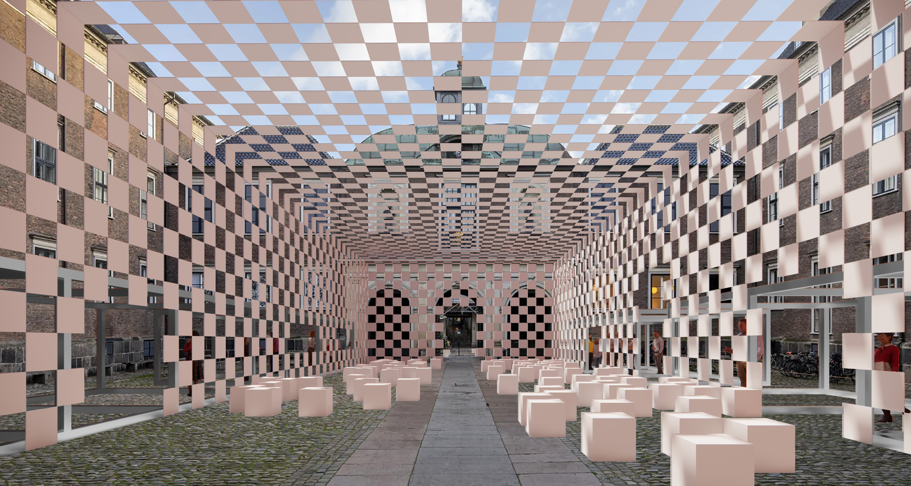 installation in the courtyard of istorical building the installation consists of squared thick fluted blurry polycarbonate pieces arranged in a pattern that covers and uncovers the building and tied together with steel ropes make each white square a thick fluted blurry polycarbonate sheet make each white box a fluted blurry polycarbonated seated cube with people seating add hundreds of people enjoying the installation behind the installation also some simple stainless steel bar structures make a beautiful realistic immersive and dramatic render in the style of a mir render