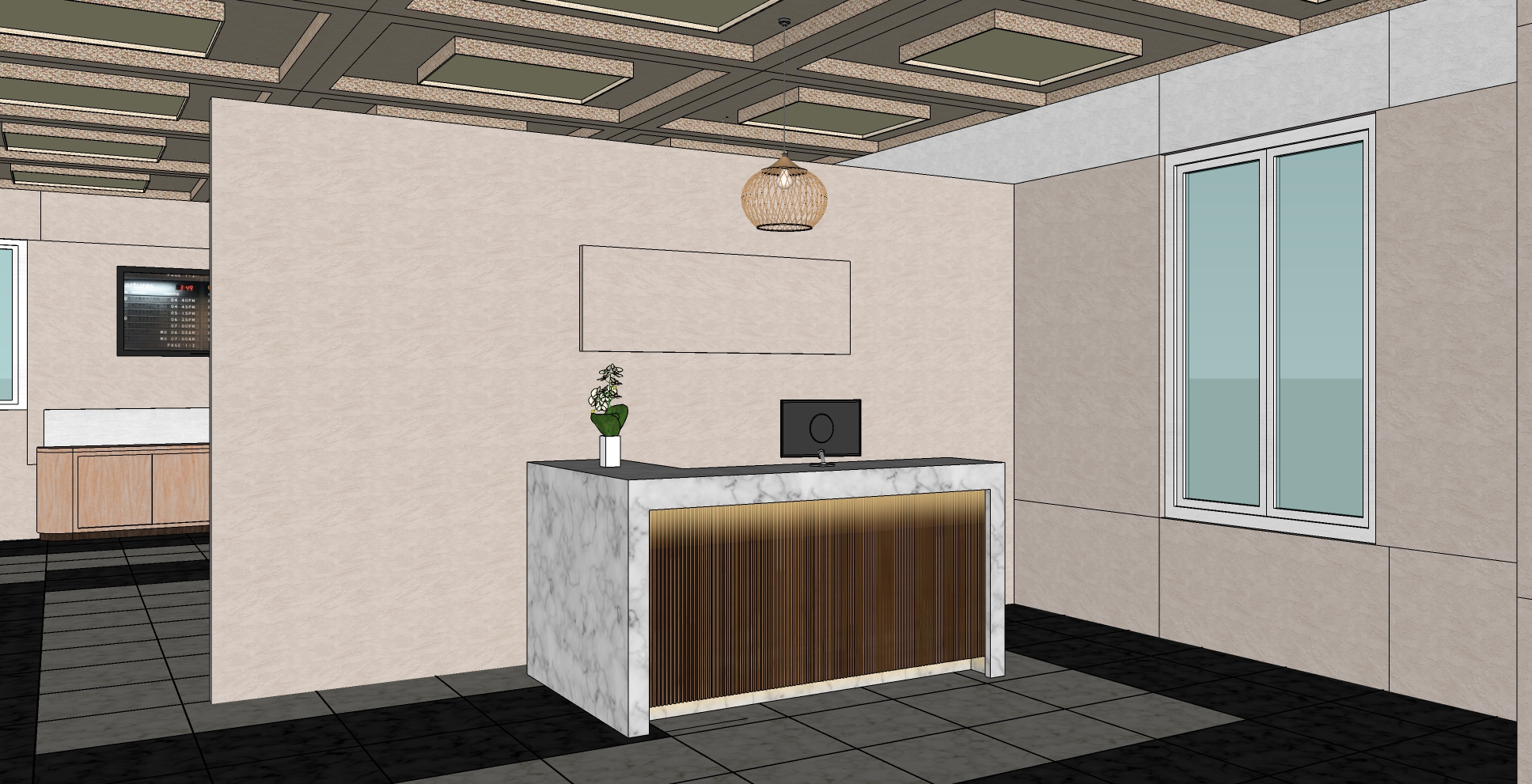 modernist exterior shot keep the existing reception desk and ceiling lighting design exactly as they are only make subtle enhancements to material realism lighting balance and overall visual richness slightly improve reflections and surface texture for a more premium look polished stone surfaces soft metallic edges and gentle ambient light maintain the original geometry proportions and detailing of the reception desk and ceiling use soft warm lighting coming from the right side realistic shadows and a clean elegant background aim for a refined understated luxury atmosphere architecture