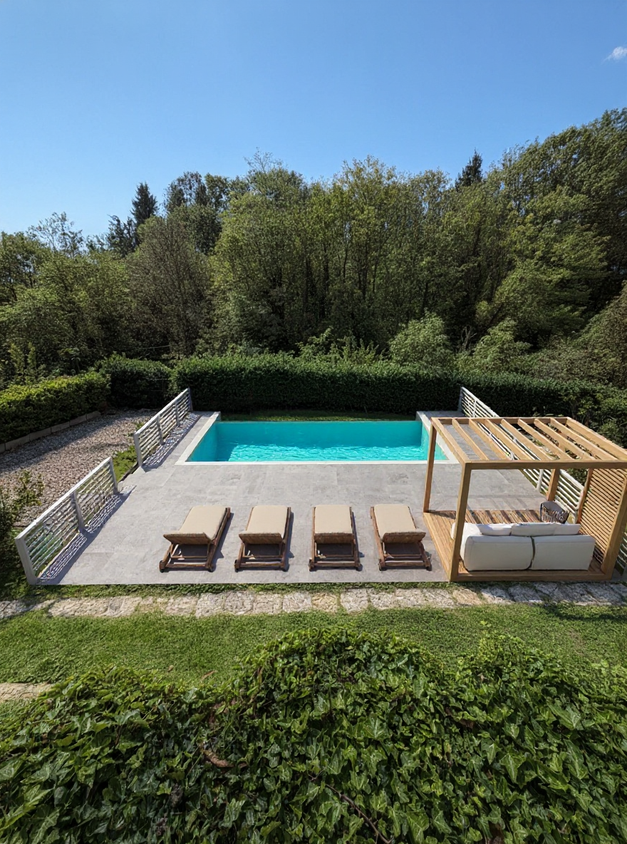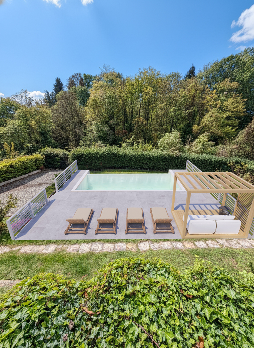 an infinity pool in a courtyard sorrounded by trees the trees are reflected on the top of the pool the solarium is made of tiles don t change the design and the object of the project