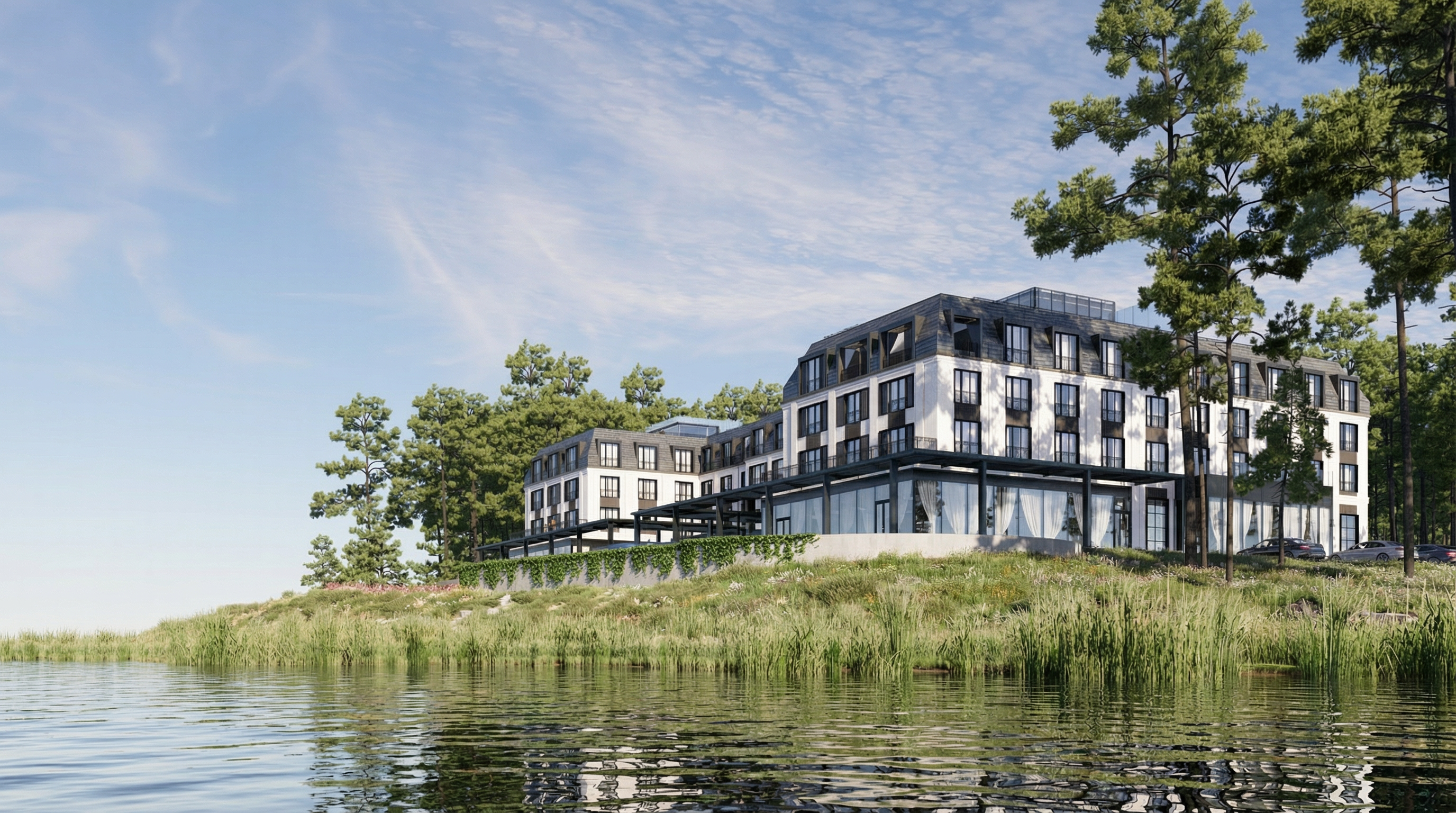 exterior shot transform this non realistic visualization into a highly photorealistic render while keeping the exact architecture proportions openings and overall composition unchanged replace all simplified or flat materials with realistic physically based ones that keep the same main color scheme but look natural and convincing matte and semi gloss paints plaster and concrete with subtle texture realistic wood with visible grain metal with soft reflections and glass with depth and transparency avoiding any plastic or cartoon look change the background environment to a realistic landscape of low mountains and surrounding forest softly shaped medium height mountains in the distance covered with mixed forest and closer background with dense trees and natural greenery all with correct scale and atmospheric perspective add a natural paved or asphalt foreground with realistic curb stones grass strips and small details like road markings or gravel transitions where appropriate add subtle natural gloss to all exterior materials according to their type with believable specular highlights and soft reflections especially on metal stone and painted surfaces enhance the windows with realistic reflections of the sky trees and surroundings in the glass while keeping interior dark enough to avoid a fake look show vertical fabric curtains inside the windows in light slightly translucent textiles hanging in soft folds partially open consistent across all glazed areas optionally add a few subtle human figures in the distance for scale without drawing too much attention dressed in everyday clothes set the lighting to a bright high key daytime mood soft even daylight with minimal deep shadows bright sky high overall exposure low contrast and very light midtones like in high key architectural photography maintain crisp but soft shadows close to the building avoid dramatic contrast or dark areas and keep colors clean and slightly desaturated for a fresh airy look the final result should be ultra realistic high detail bright high key exterior architectural photography style