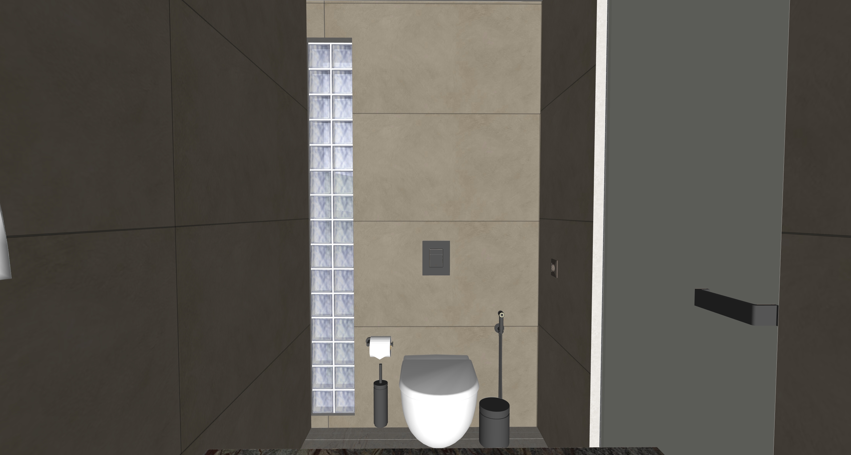 keep same geometry more realistic lighting and materials wc of a luxury summer villa the wall are tiles dimension 0 60m 1 20m with stone feeling add hidden led lights around the window