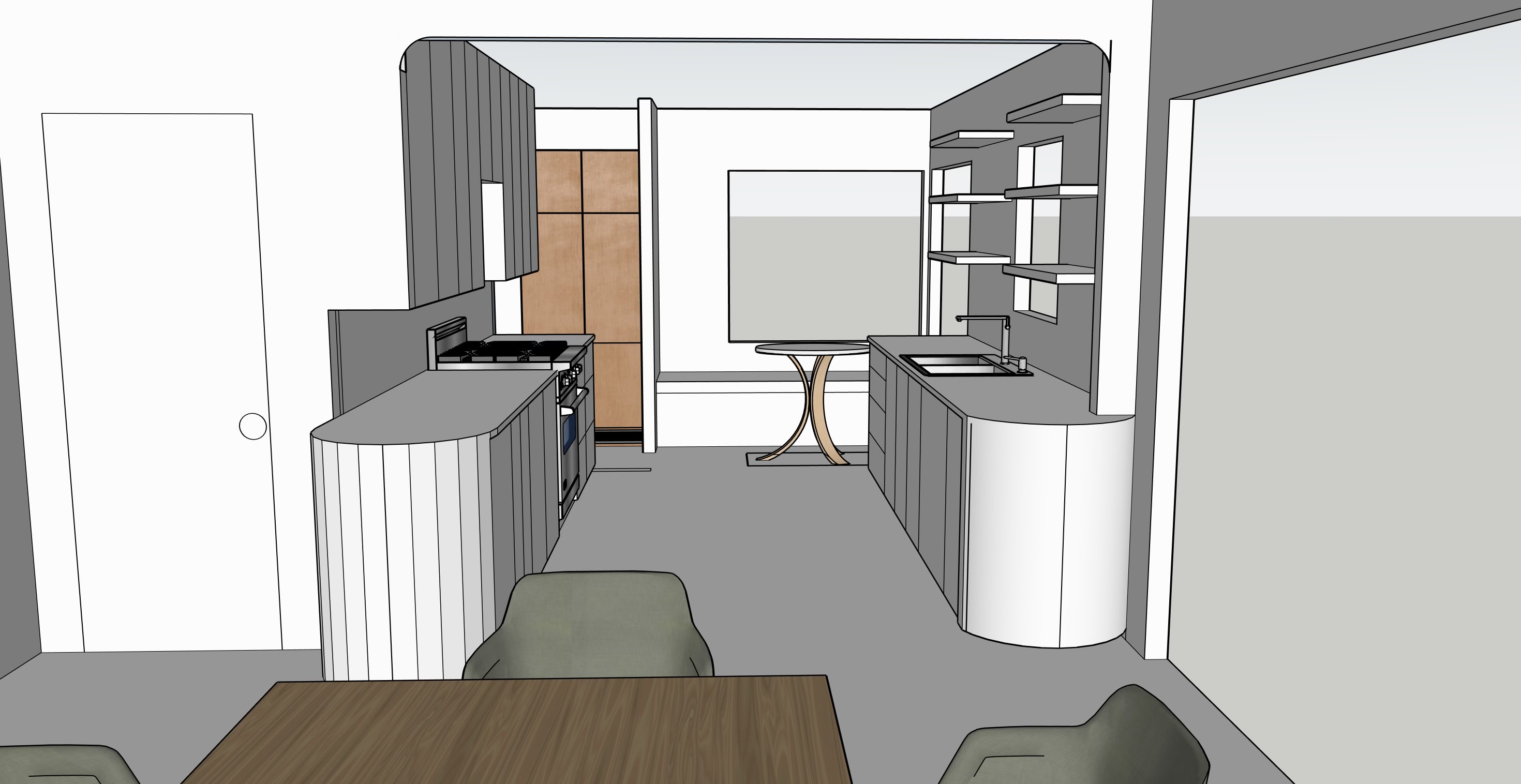 add marble to counter and backsplash marble should be cream and a faded peach color same marble for counter and backsplash use sand colored wide plank oak floors cabinets should be medium toned walnut unlaquered brass cabinet pulls and faucet the bench should have an upholstered cushion on it that is a faded coral pinstripe with blue piping the table should be walnut