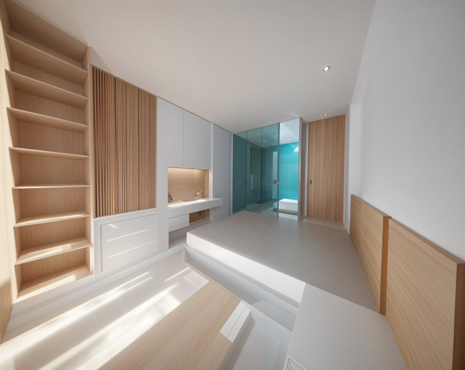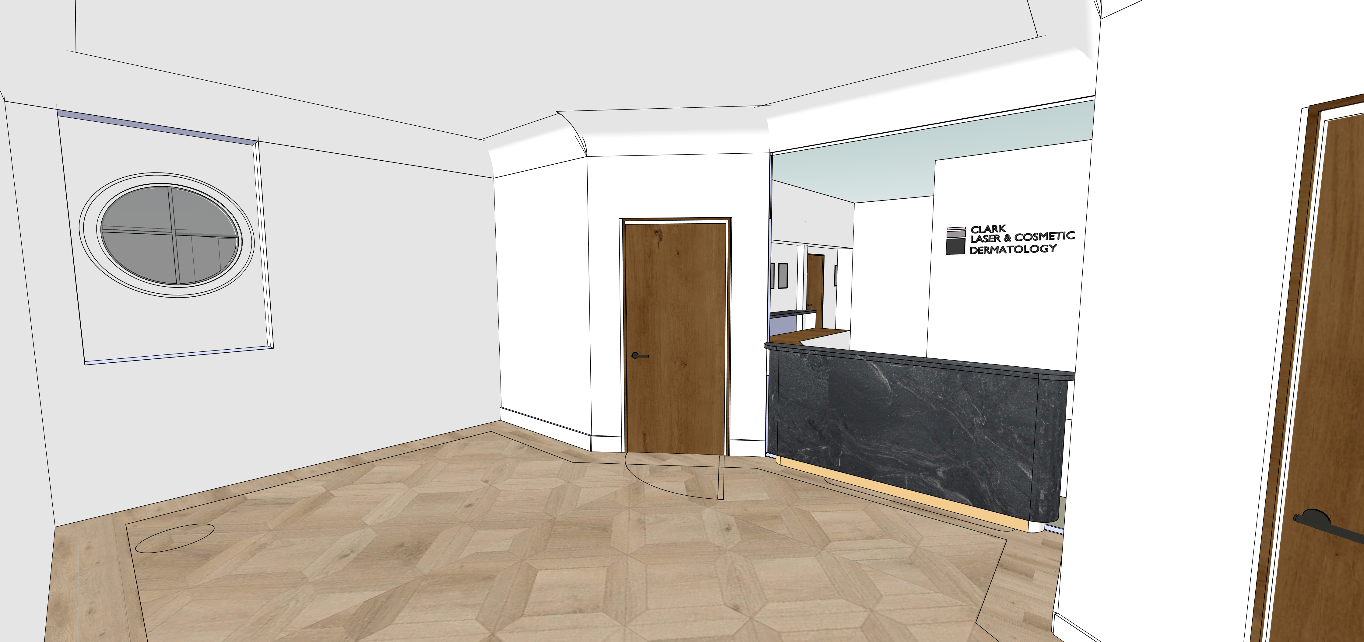 render a modern sophisticated interior design of a cosmetic dermatology office use a bright welcoming atmosphere with soft natural lighting color the walls in a pristine white to evoke cleanliness and professionalism choose a rich medium brown for the wooden doors to add warmth select a luxurious dark grey marble for the reception desk giving it a sleek finish incorporate a light beige parquet floor pattern for an elegant touch the window should have a subtle blue tint to enhance the calming ambiance