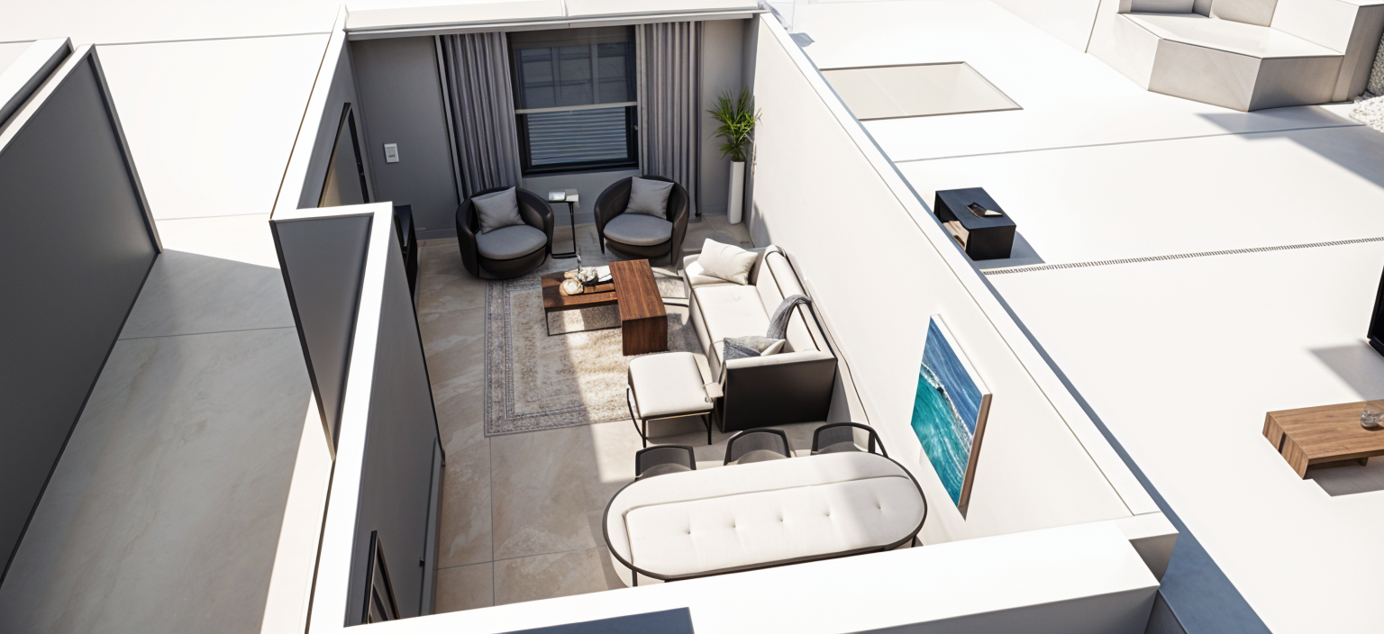 interior shot blue fabric seats white tiles on the sidetable architecture