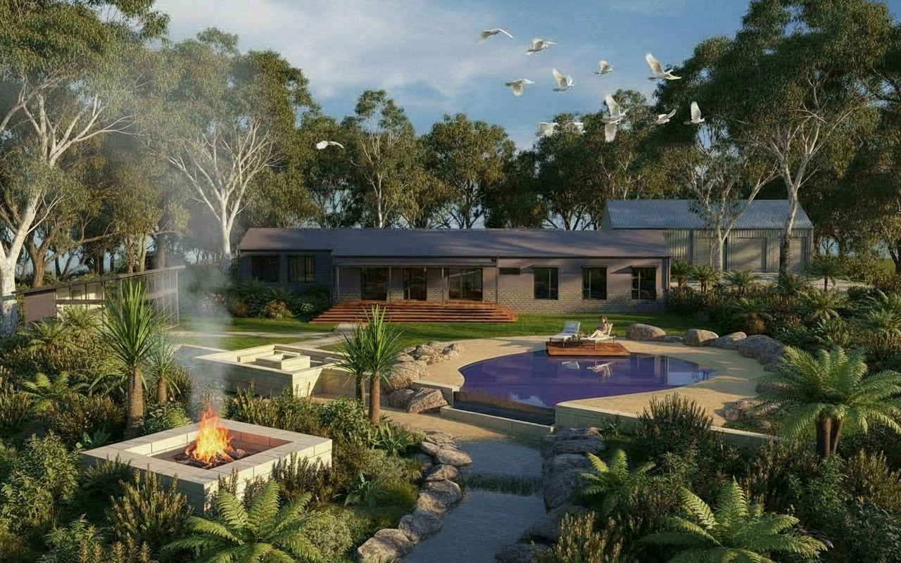 create the image in a night view the trees should be lightly illuminated from below in certain places the pool should be illuminated but only slightly