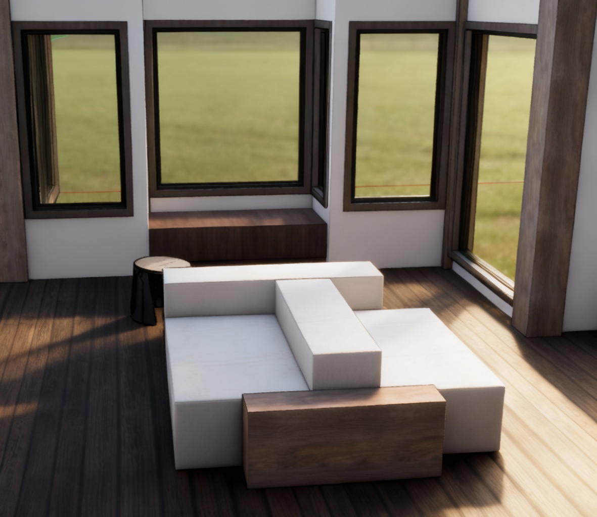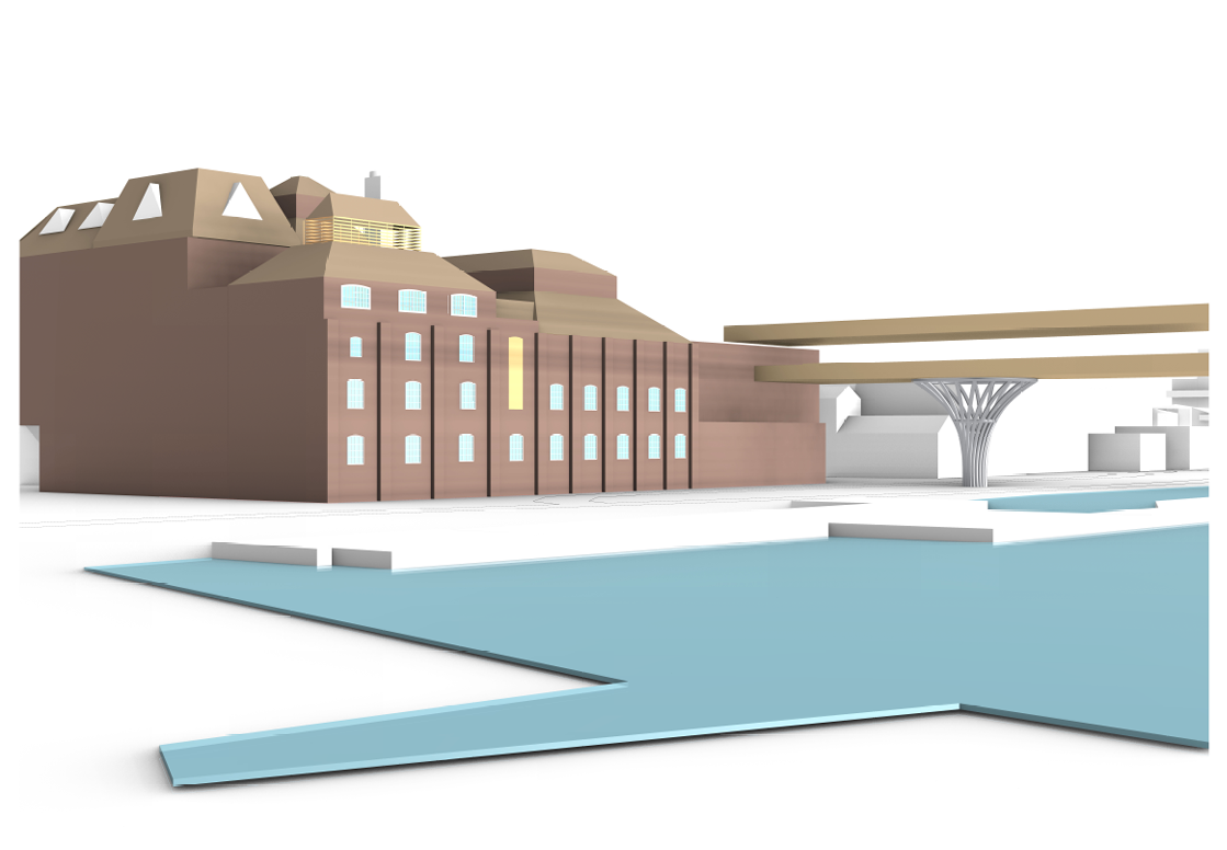add material to the brewery light brown brick add some doors and windows to the wall that is connecting to the bridge make the bridge that is connecting to the brewery looks better and add some wood platforms on the water add some shadows