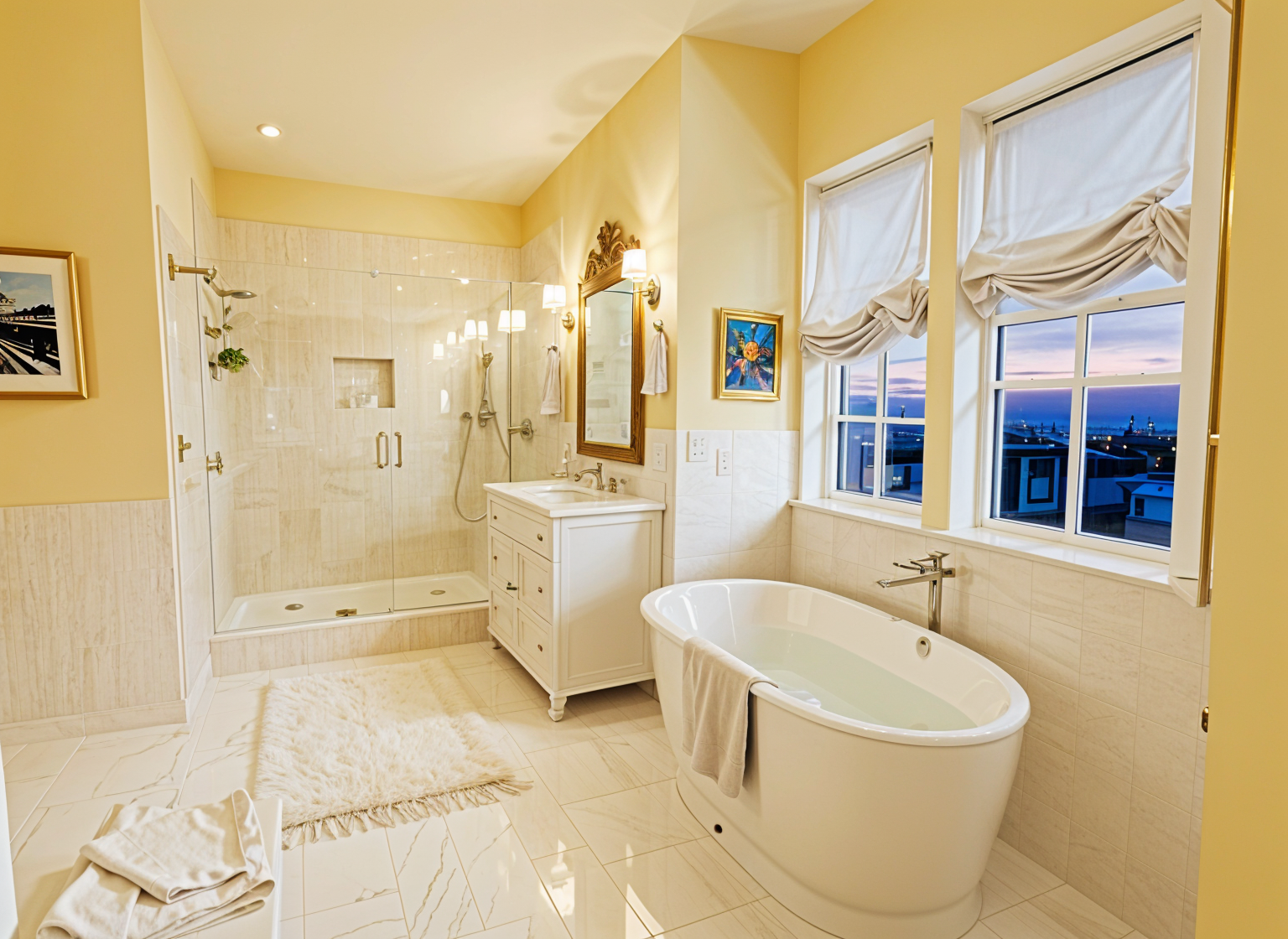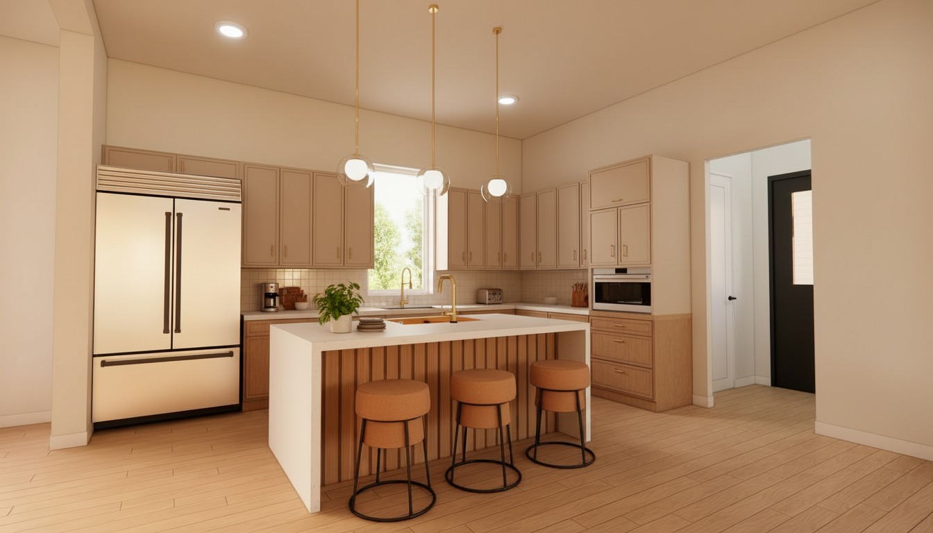 keep the exact same geometry scene content object positions materials textures and camera framing as the original render apply only atmosphere lighting mood and color grading set the scene at midday sky with thin soft clouds and a cool to warm gradient steel blue overhead transitioning to warm tones near the horizon use cinematic soft lighting with moderate contrast gentle shadows cool ambient fill and warm interior window glow inviting realistic wet ground with realistic reflections on asphalt paving subtle specular highlights very subtle bloom around light sources crisp but natural detail plus a very light atmospheric haze for depth color grade cool shadows cool midtones warm highlights teal in shadows and midtones warm highlights controlled saturation clean neutrals no oversaturation photorealistic architectural marketing render look balanced exposure slightly cool white balance remove the fog make it brighter