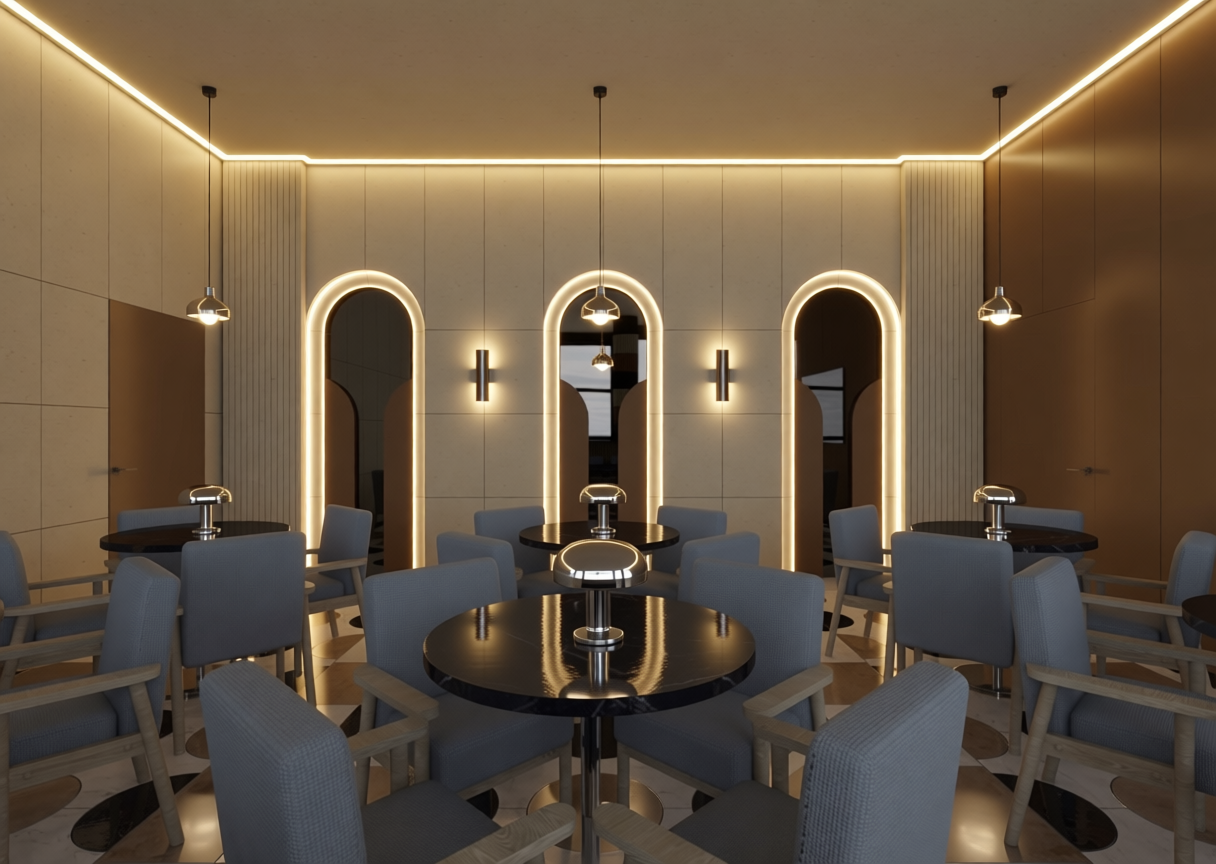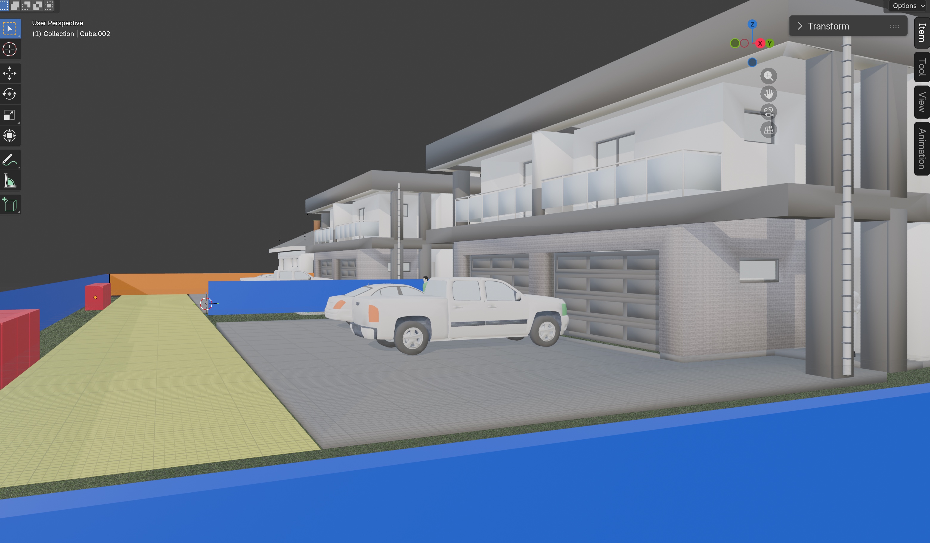 create a photorealistic high quality visualization of a modern housing estate composed of two semi detached single family houses do not modify the architecture in any way keep every element exactly as in the provided model the flat roof all dimensions proportions wall placements window and door positions balconies volumes and overall layout must remain unchanged waste bin shelters are red marked must be modern enclosures made of horizontal anthracite composite panels with an anthracite metal frame closed on three sides with a front opening access door location of bins along fence along internal road the entrance gate in the background and the entire front fence section orange marked should be made of vertical slat metal panels with 40 mm spacing in anthracite color combined with graphite colored concrete block pillars with the slats open at the to the entrance gate opens to the access road use a double leaf driveway gate that opens inward toward the estate add a pedestrian gate on the right side of the main gate place the concrete pillars sparsely to keep the fence visually light all remaining fence segments navy marked must use wire mesh fencing 3d fence panel varnished anthracite 153 cm height mesh 50x200 4 mm wire inside the estate create an internal street yellow marked made of elegant small gray paving stones leading to the garage driveways maintain all exterior materials exactly as in the model white plaster fa ades graphite mat flat roof graphite concrete pillars dark gray brick tile cladding around garages subtly visible anthracite gutters transparent glass balcony balustrades with slim metal frames arrange gardens only inside the estate not outside the fence using shrubs thuja trees lavender grass and low greenery for the four internal garden areas in the background add birch trees conifer trees and grass add modern car entering the estate add people and birds for realism render from human eye level with soft afternoon lighting and slight cloud cover the final image must be photorealistic natural and preserve all architecture exactly as modeled