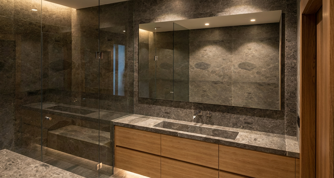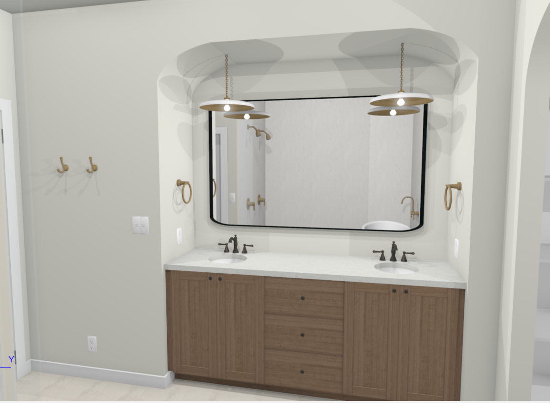 a french country style bathroom with soft neutral colors gold accents in lighting and hooks a soft curved ceiling to add detail