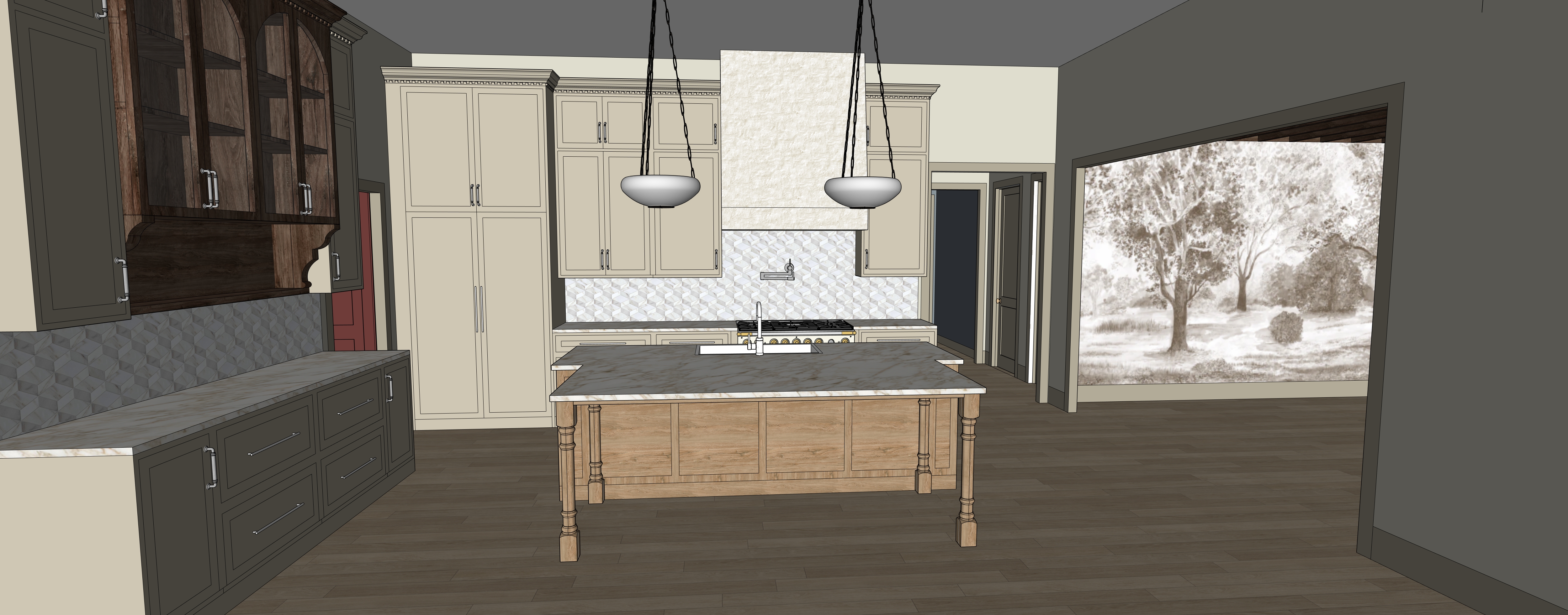 ai photorealistic rendering prompt kitchen prompt create a highly photorealistic interior rendering of a traditional character rich kitchen using the provided sketchup model as a fixed architectural reference maintain all geometry exactly as shown island size and placement cabinetry layout range wall hood proportions ceiling height openings and camera perspective must not change this is a finished professionally photographed space not a concept rendering overall mood warm layered and timeless refined but not precious a new build that feels collected and lived in soft natural light with gentle shadowing subtle contrast nothing overly crisp or flat materials finishes island primary feature light to medium warm oak with visible grain variation slight patina and tonal inconsistency not uniform matte finish softly worn edges legs read as furniture subtle softness at edges perimeter cabinetry warm muted cream not bright white slight depth and undertone stone putty based painted finish with minimal sheen accent cabinet left side dark stained wood deep walnut tone rich variation slightly aged interior softly lit warm glow countertops honed marble or limestone soft veining low contrast matte finish no gloss or harsh reflections backsplash important replace geometric tile with hand applied plaster or tumbled limestone zellige very subtle tonal irregular no strong pattern quiet textural imperfect range hood plaster or limewash finish slight tonal variation and movement blended seamlessly into wall flooring wide plank wood medium warm brown tone with variation matte finish slightly worn not glossy lighting fixtures aged brass or darkened metal slight patina not polished soft diffused light no harsh brightness lighting behavior natural daylight as primary source light entering from adjacent spaces windows soft shadows realistic falloff no overexposed highlights styling light editorial keep styling minimal and intentional a few antique or vintage accessories wooden cutting boards ceramic or stoneware pieces linen towel draped casually nothing cluttered or staged rendering quality ultra photorealistic magazine quality accurate material textures wood grain plaster variation stone softness no artificial sharpness or cartoon like edges realistic depth of field very subtle balanced exposure slightly moody not bright white key constraints do not change do not alter layout proportions or architecture do not modernize the design do not introduce trendy elements do not over style or over light