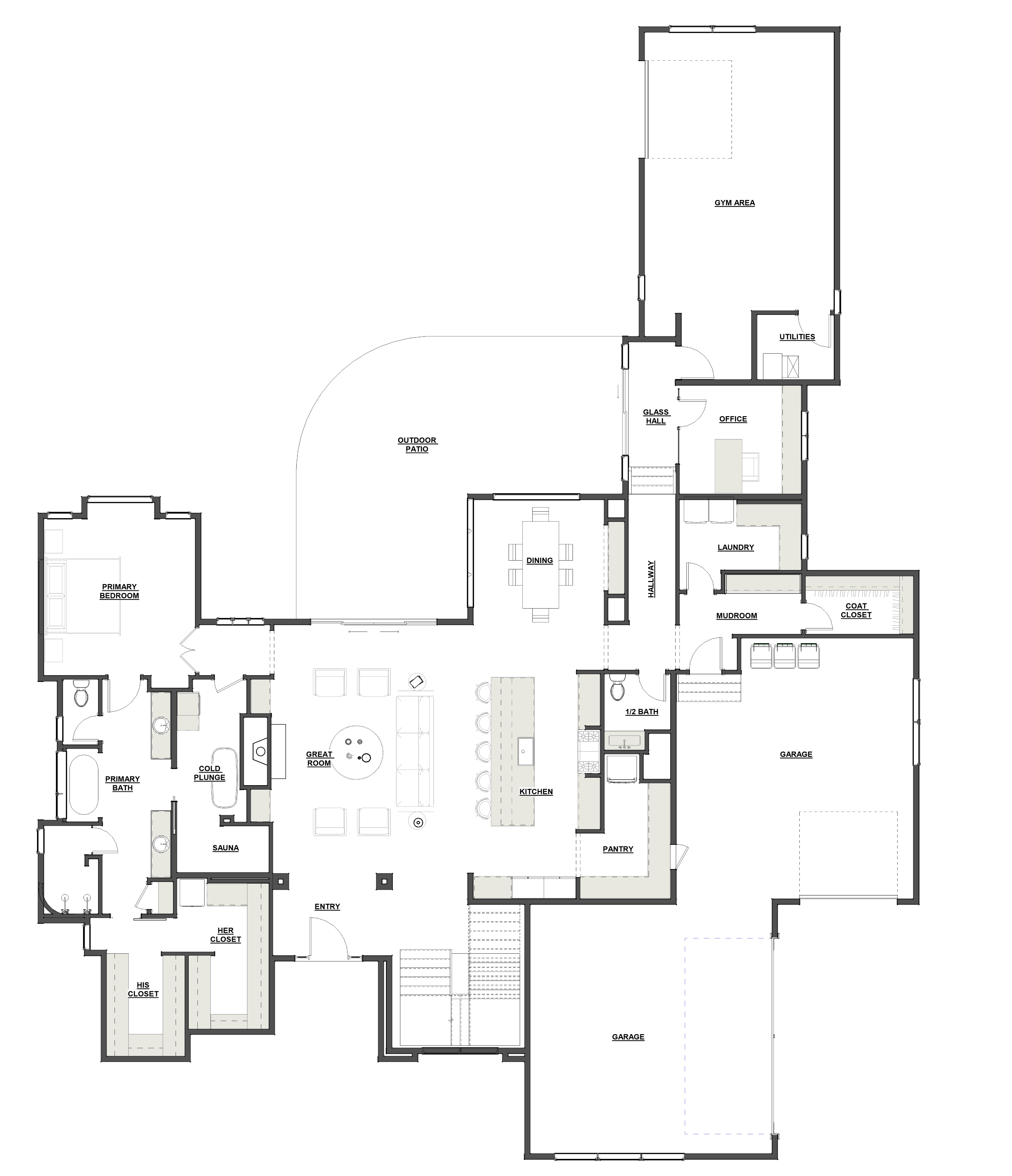 convert this floor plan into a realistic isometric 3d view of a full house show the space from an elevated angle with furniture walls and details visible moody scandinavian style use the same furniture as shows on the plan do not change the orientation of the floorplan