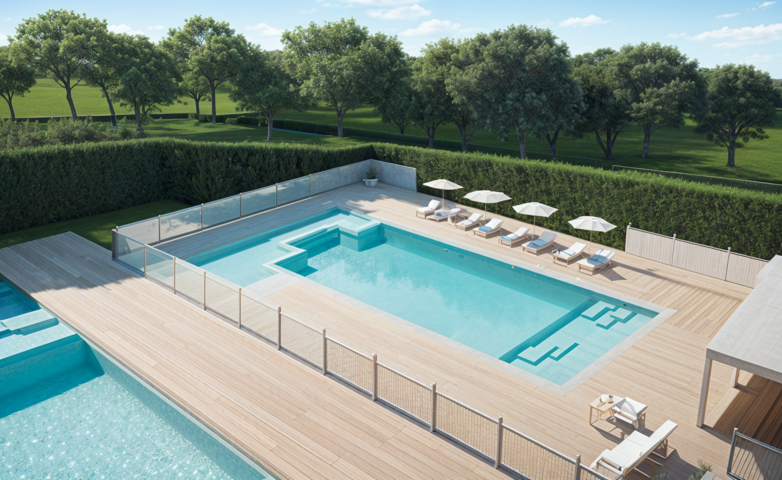 exterior shot render a serene outdoor swimming pool area surrounded by lush vibrant green trees the pool surface is a shimmering aqua blue while the pool deck is a warm sandy beige arrange six white lounge chairs with elegant light grey umbrellas providing shade the fence encircling the pool is a sleek modern black in the background create a subtle gradient sky transitioning from light blue to soft pink capturing a tranquil early evening atmosphere incorporate a stylish stone grill area in natural earth tones adding a cozy and inviting feel to the scene architecture