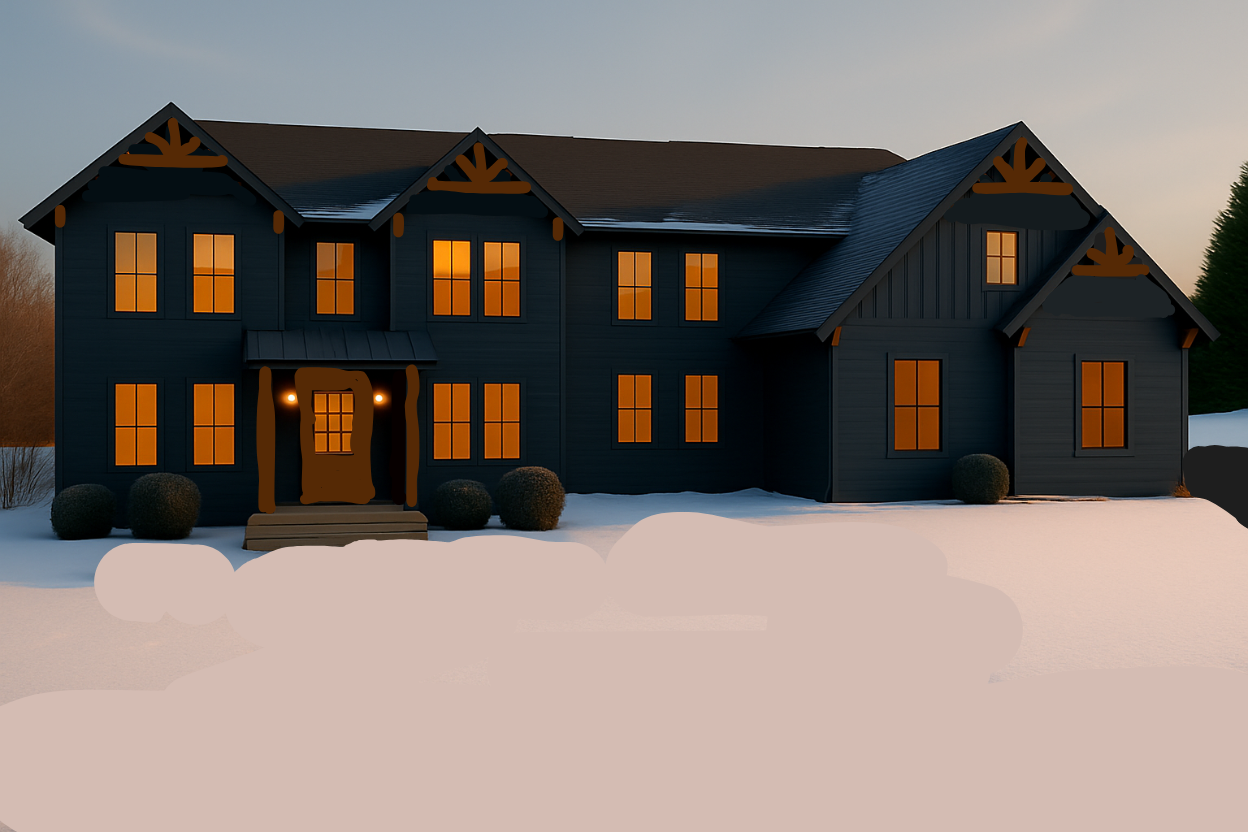 exterior shot i need the pilars at the front door to be perfectly straight make the wooden decorations at the peaks much smaller dark blue siding