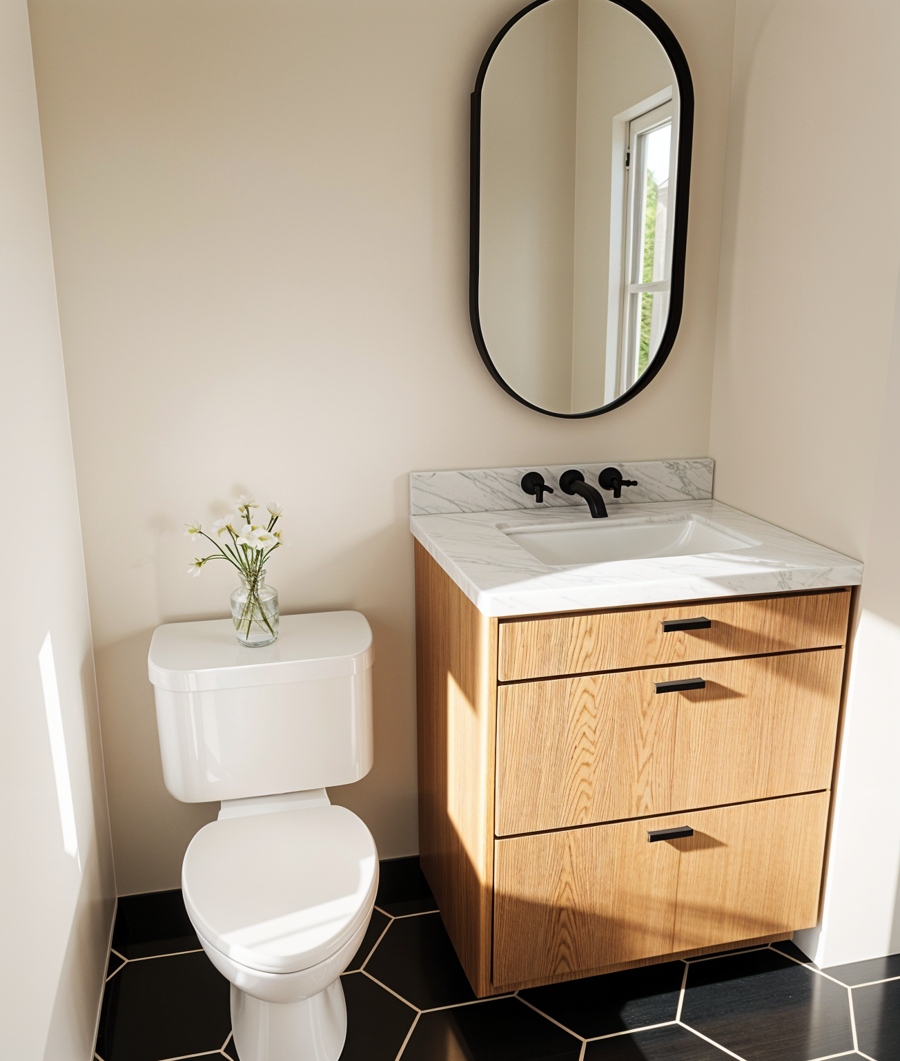 exterior shot make kitchen look upscaled with black and white floor tile and black cabinets