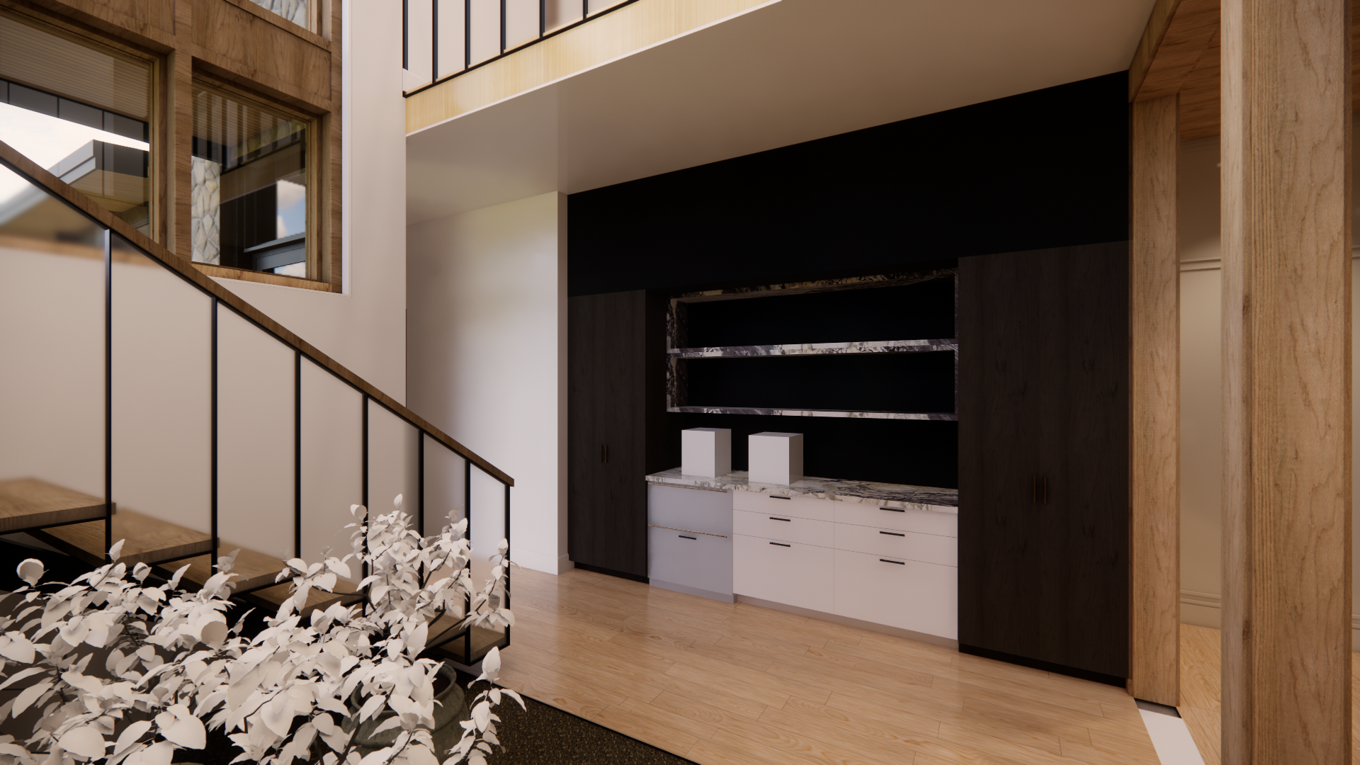 make the stone a natural stone with no veining change the three drawer cabinets and tall shelves to be black wood