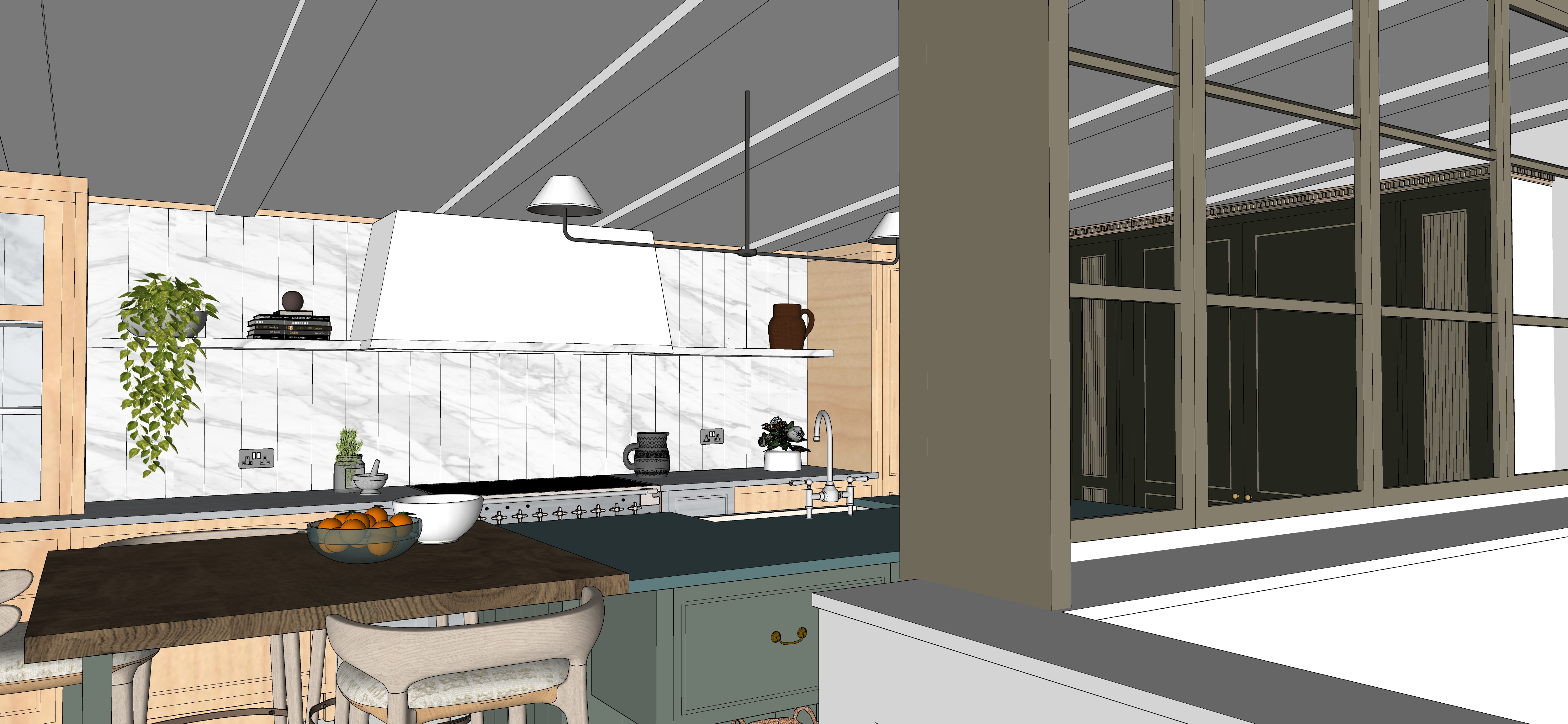 add natural daylight island unit with shiny green enamel top with end grain walnut above bar stools add led lighting to underside of marble wall shelves