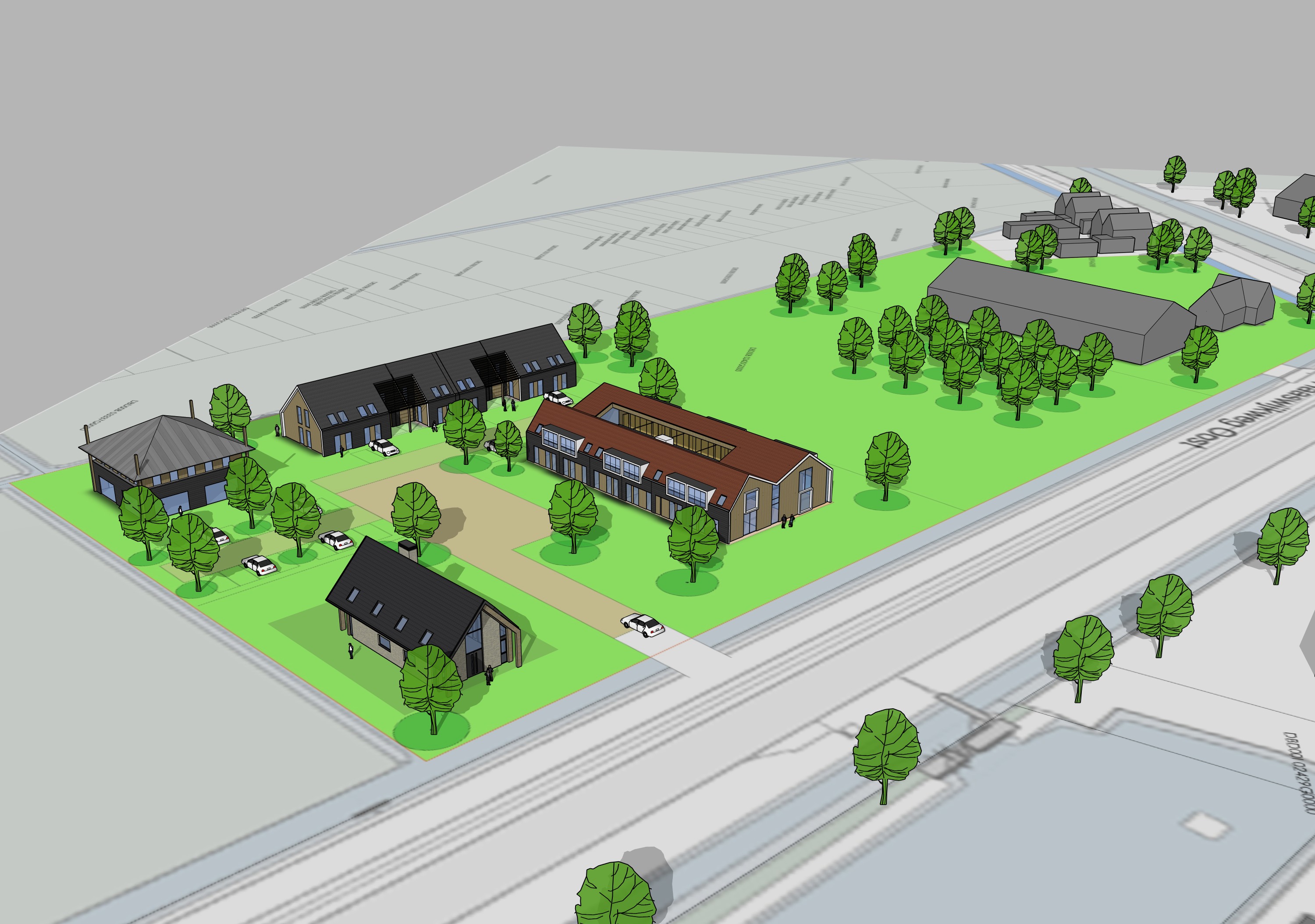this is a rural scene the grey areas around the buildings are grass meadows