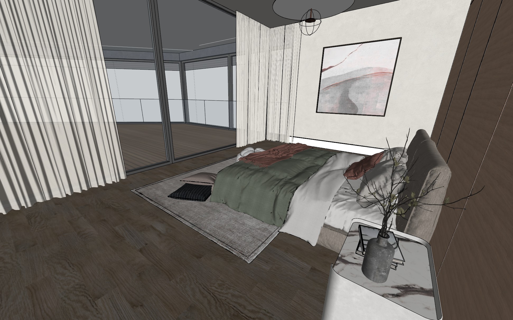 make bedroom realistic covered porch behind the glass with a view to the lake covered porch to have flat tongue and groove ceiling gypsum board ceiling inside the bedroom