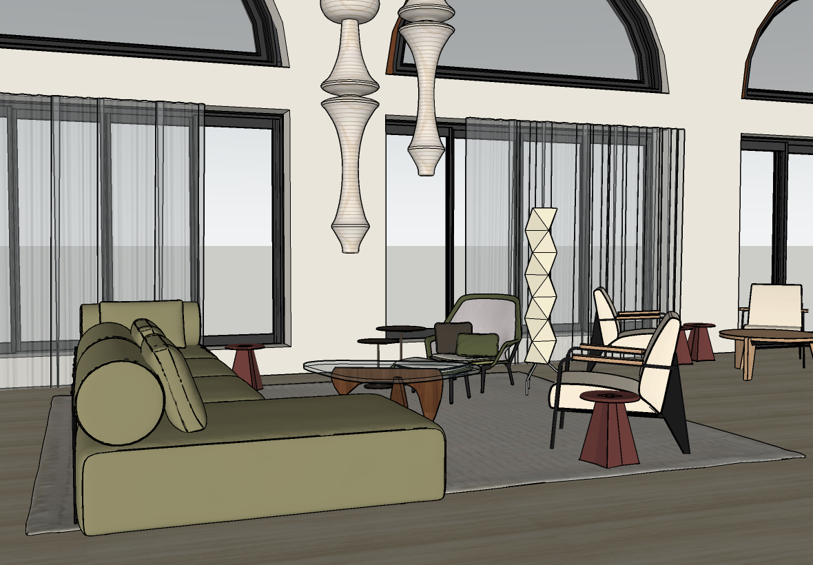 render this sketchup model into a highly realistic 3d interior visualization without changing moving or redesigning any layout geometry proportions or furniture placement ensuring the original design intent is fully preserved enhance the scene with realistic materials and textures add a blurred urban city lanscape outside the windows with greenery make the lighting like a well lit furniture showroom