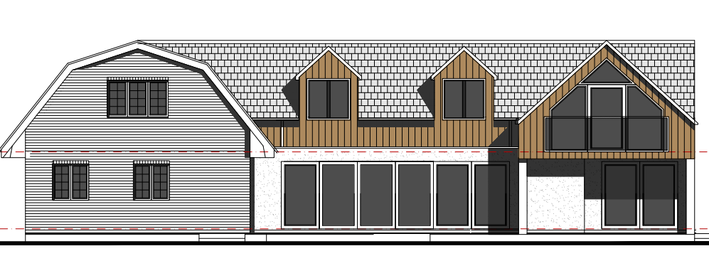 use a weathered yellow brick for the leftside gable end and white render for the rest of the ground floor facing material fascias should be wooden add trees to the background sun is top right areas of brown are to be timber cladding all doors to be dark grey the top floor is set back from the the ground floor