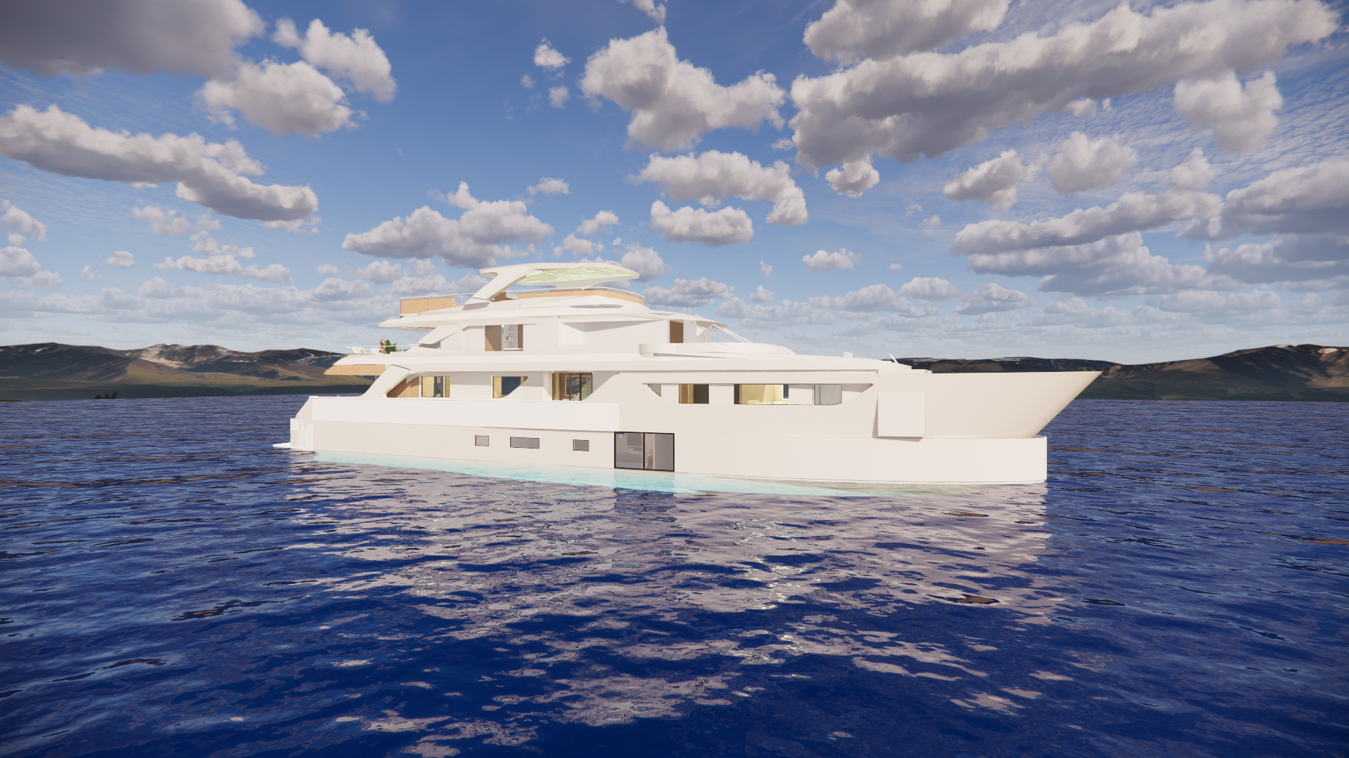 edit the exterior of the yacht to be dark green on the lower half almost angling up and covering up to the bow or rather the tip of the yacht similar in the reference image do not add additional windows keep the original on the bottom do not change the layout of the yacht at all only the color keep it minimal and clean