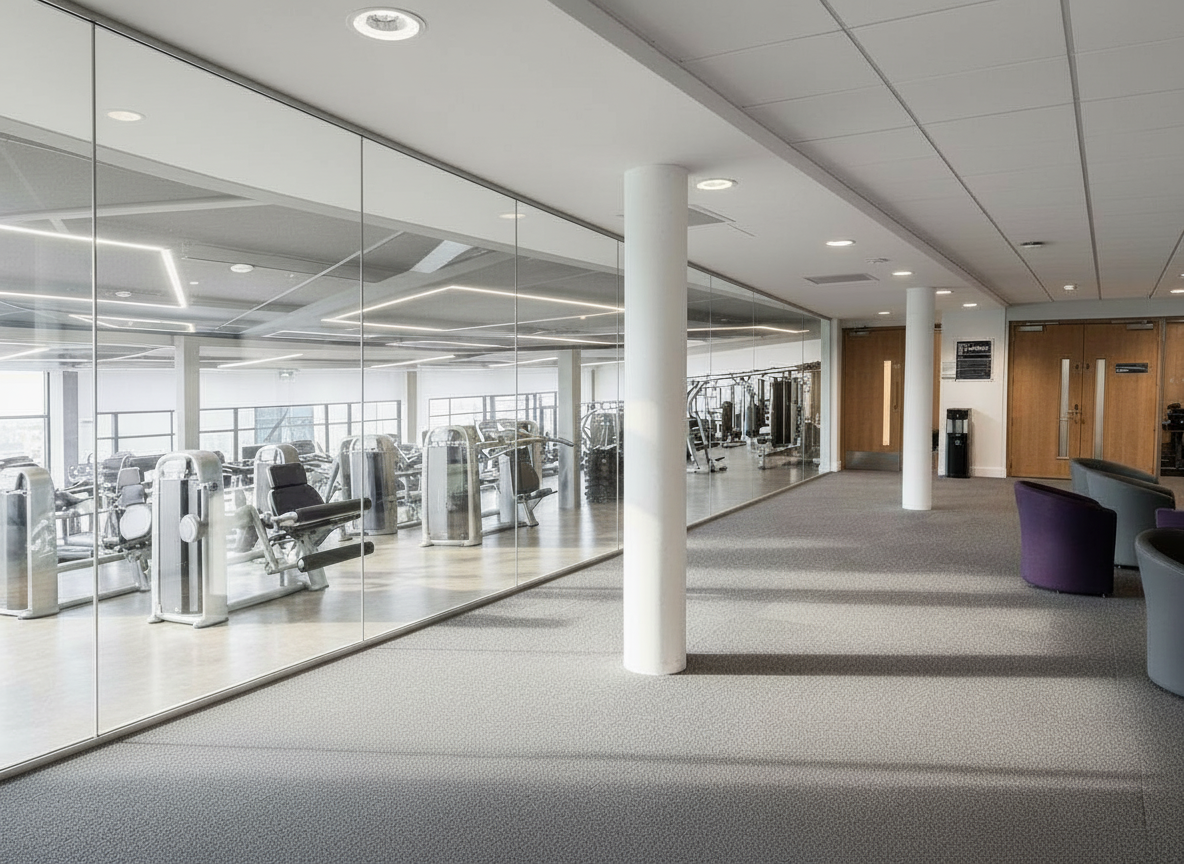 keep the existing composition and materials of the interior unchanged add a casual relaxed lounge seating area located strictly between the structural columns on the right hand side of the interior space before the gym entrance individual modern lounge chairs with soft plush upholstery organic curved forms neutral or warm muted tones that complement the carpet low profile coffee tables in any shape between chairs chairs arranged in an informal staggered layout for casual conversation add a couple of small indoor plants nearby to enhance warmth and relaxation subtly change the flooring only within the area between the structural columns to a distinct material e g light wood polished concrete or textured tile to visually define the lounge zone leaving all flooring outside the columns unchanged chairs slightly angled toward the center of the column span for natural integration modern minimalist design with cozy and inviting appearance subtle shadows and natural lighting consistent with the environment ultra realistic rendering high detail architectural visualization maintain modern luxury aesthetic no changes to glass curtain wall main carpet or gym interior outside the lounge area do not add any people maintain all existing lighting reflections and material finishes