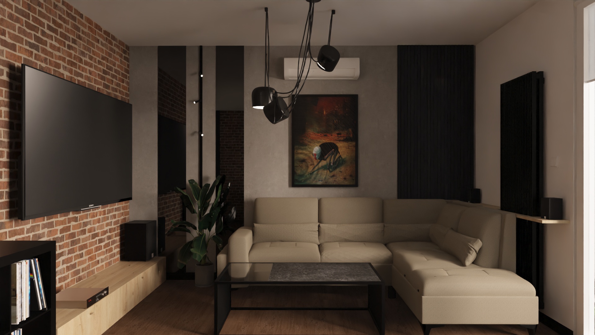 salon styl loft industrialny wyostrz czarne lamele na cianie w prawym rogu