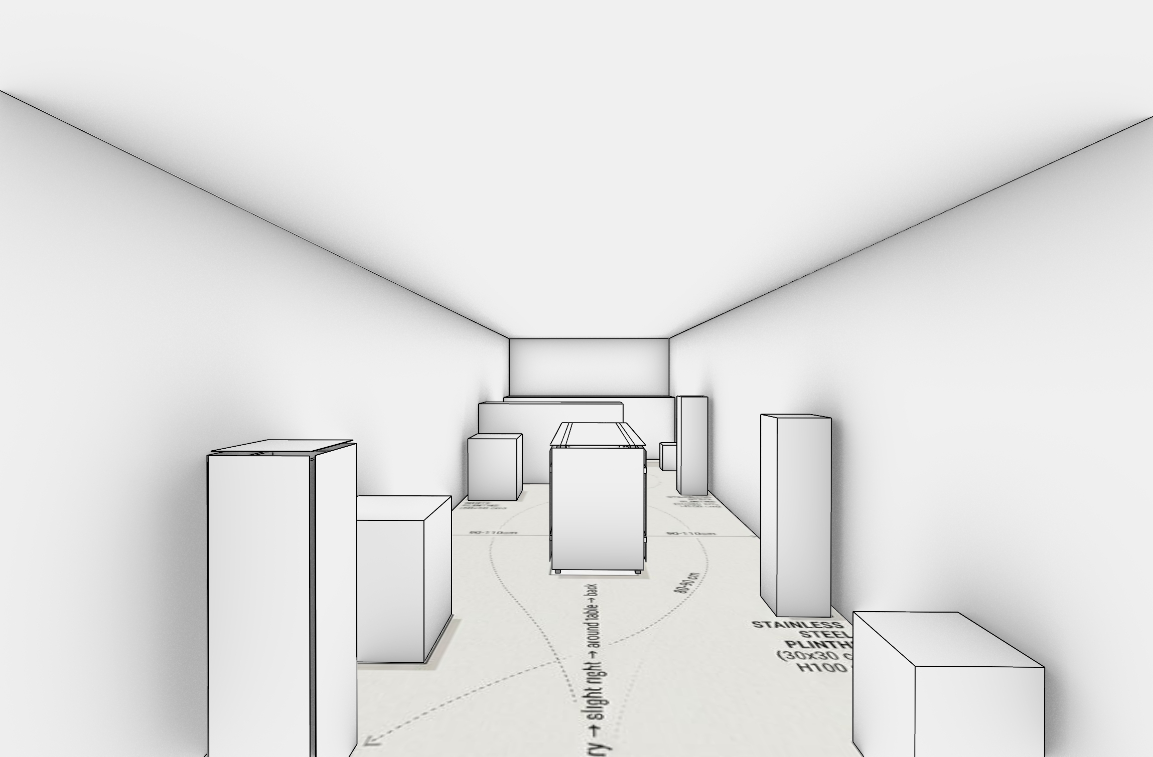 narrow elongated gallery interior 3 2m wide and 8 5m long very low ceiling at 1 8m height strong axial perspective slightly off center view from entrance space with raw white plaster walls and ceiling uneven surface subtle texture slightly imperfect soft shadows revealing surface irregularities floor made of matte cast concrete slightly rough natural tone subtle variations and imperfections no gloss central rectangular display table 140x80 cm with sculptural floral arrangement ikebana like minimal and refined few carefully placed plinths reduced number all faces made of galvanized steel with large spangle pattern shimmering subtly under light plinth construction with exposed solid oak frame at edges visible structure and joints open corners precise and crafted strong contrast between rough architectural shell and refined constructed plinths lighting with track lights on both sides directional spotlights creating pools of light on plinths and flowers background in soft shadow ceiling remains visible but subdued emphasizing compression of space atmosphere calm quiet slightly dramatic almost sacred cinematic architectural photography ultra realistic soft grain high dynamic range 35mm lens subtle depth of field
