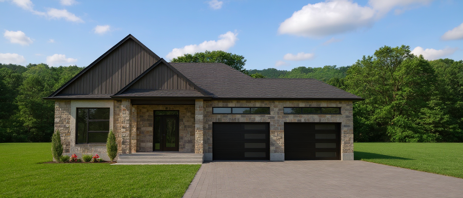 a new modern home that has two tones of siding stacked stone highlights and dark trim details reflective windows 3d photorealistic perspective rendering architectural