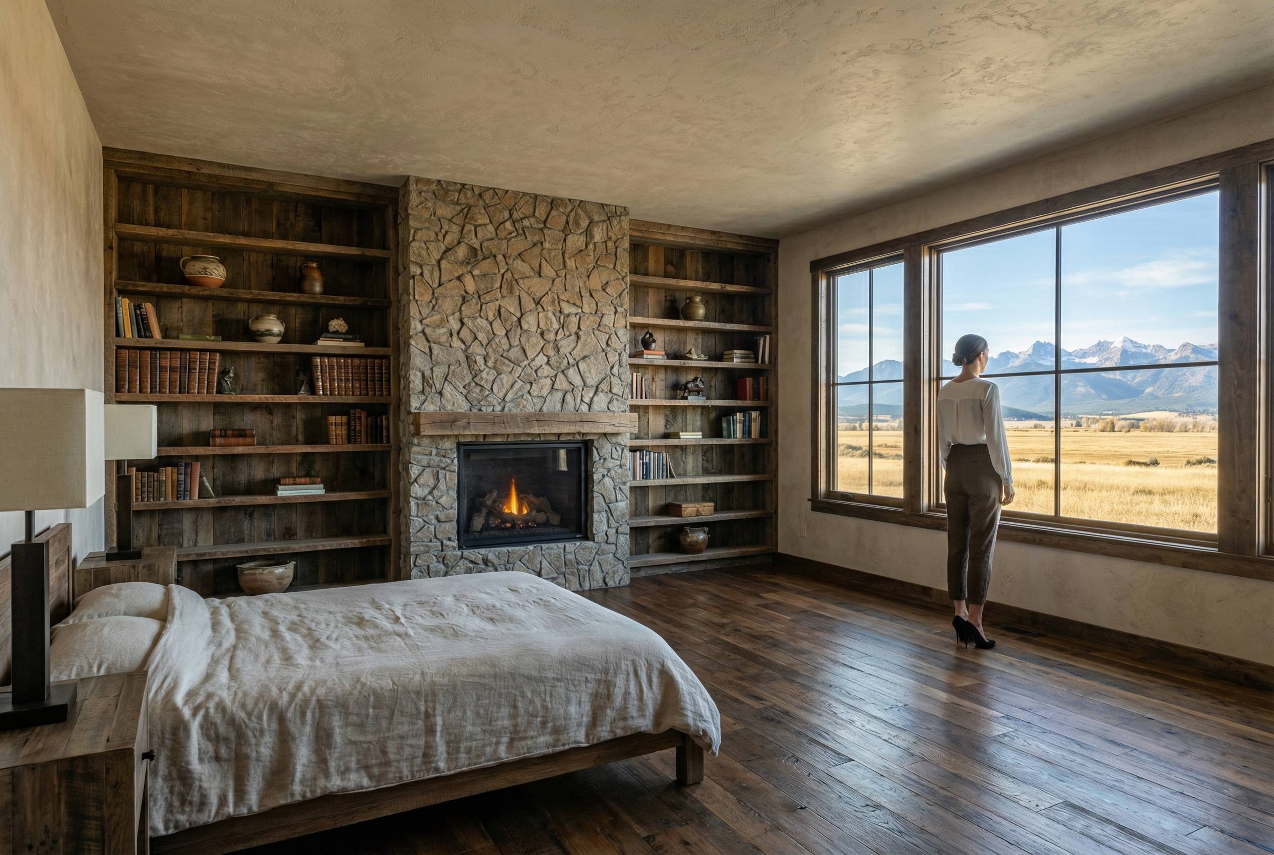 mountain modern single story house with a warm and inviting atmosphere featuring a roycroft bottle green and iron ore accent and black fox trim exterior black grey asphalt shingles and the beams should be woodscapes hawthorne sw3518 the house has a prominent wood framed gable entrance surround it with lush green grass and mix of landscape and hardscape and add a smooth asphalt driveway with concrete sidewalk leading to the entrance the sky is clear and bright blue with misty white clouds enhancing the tranquil and sunny setting set in a field in a valley