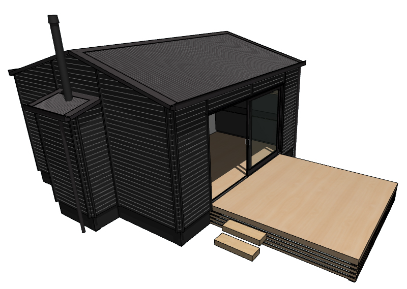 black weatherboard cladding black roof black window frames lawn low timber deck extensive native planting background trees sunset