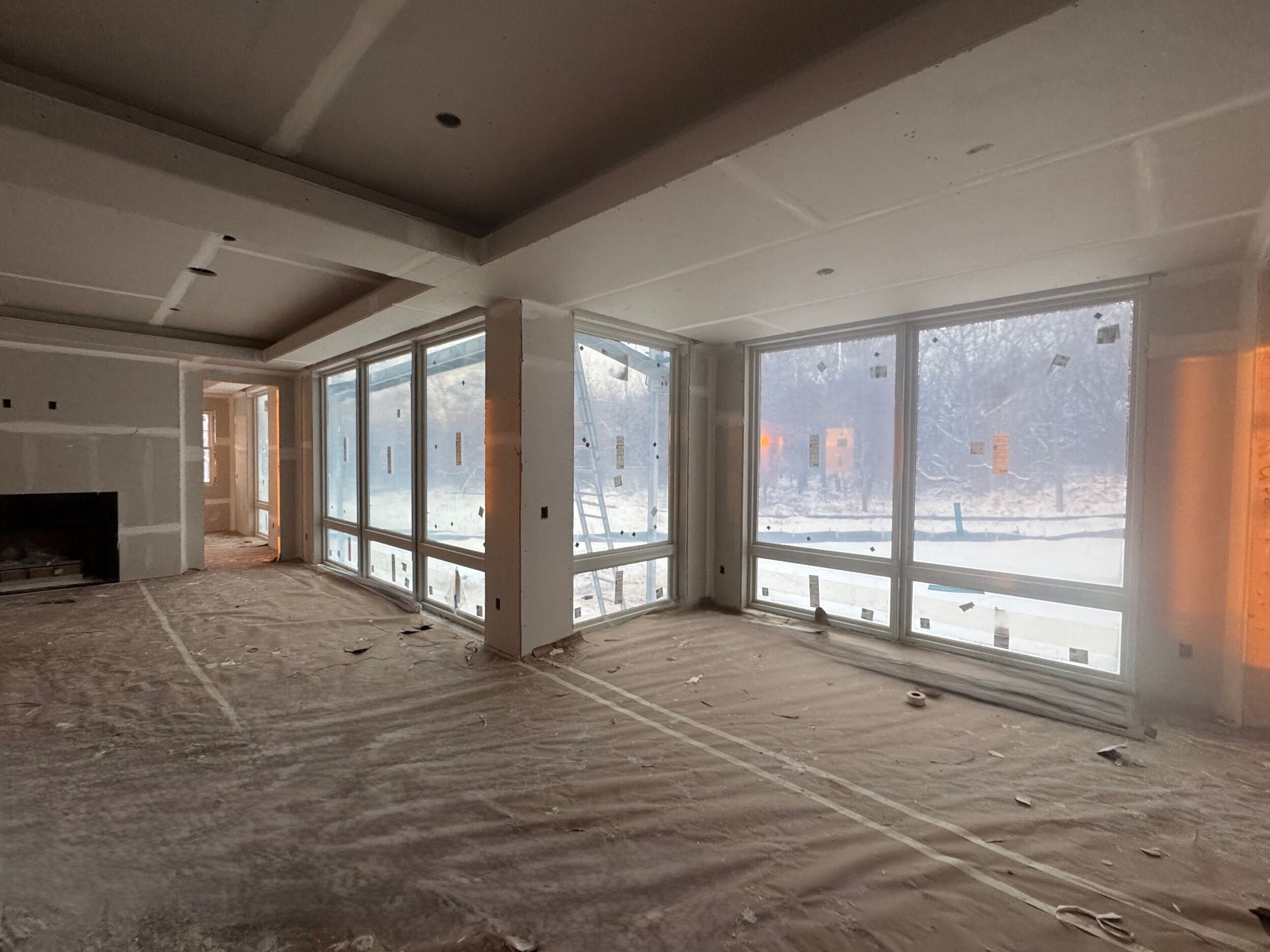 modernist exterior shot clean room brighten windows wooded backdrop architecture