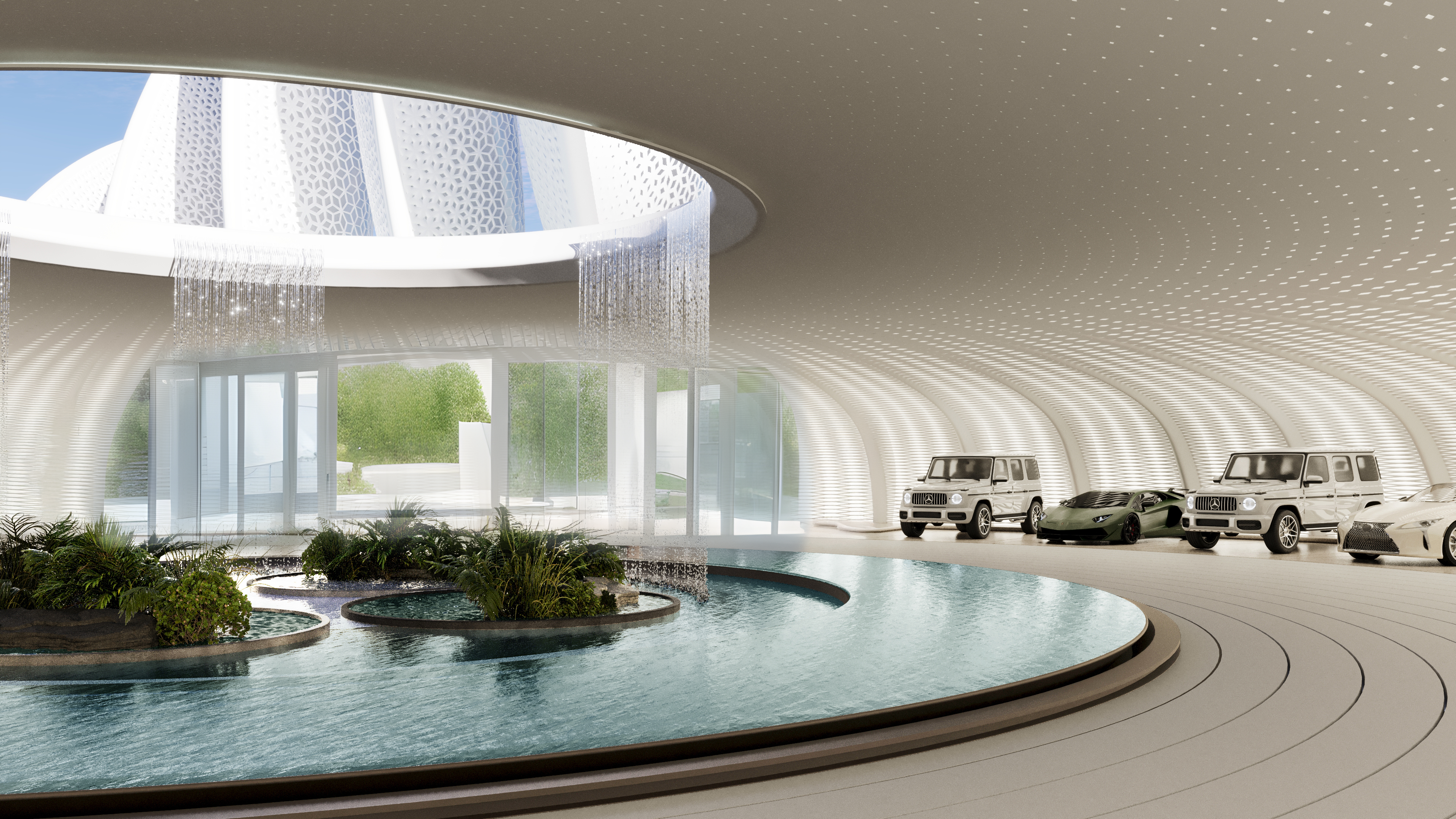 modernist interior shot make the gate at the end curvy white and nicer like a shell zaha style behind the gate is recreational center make it realistic architecture