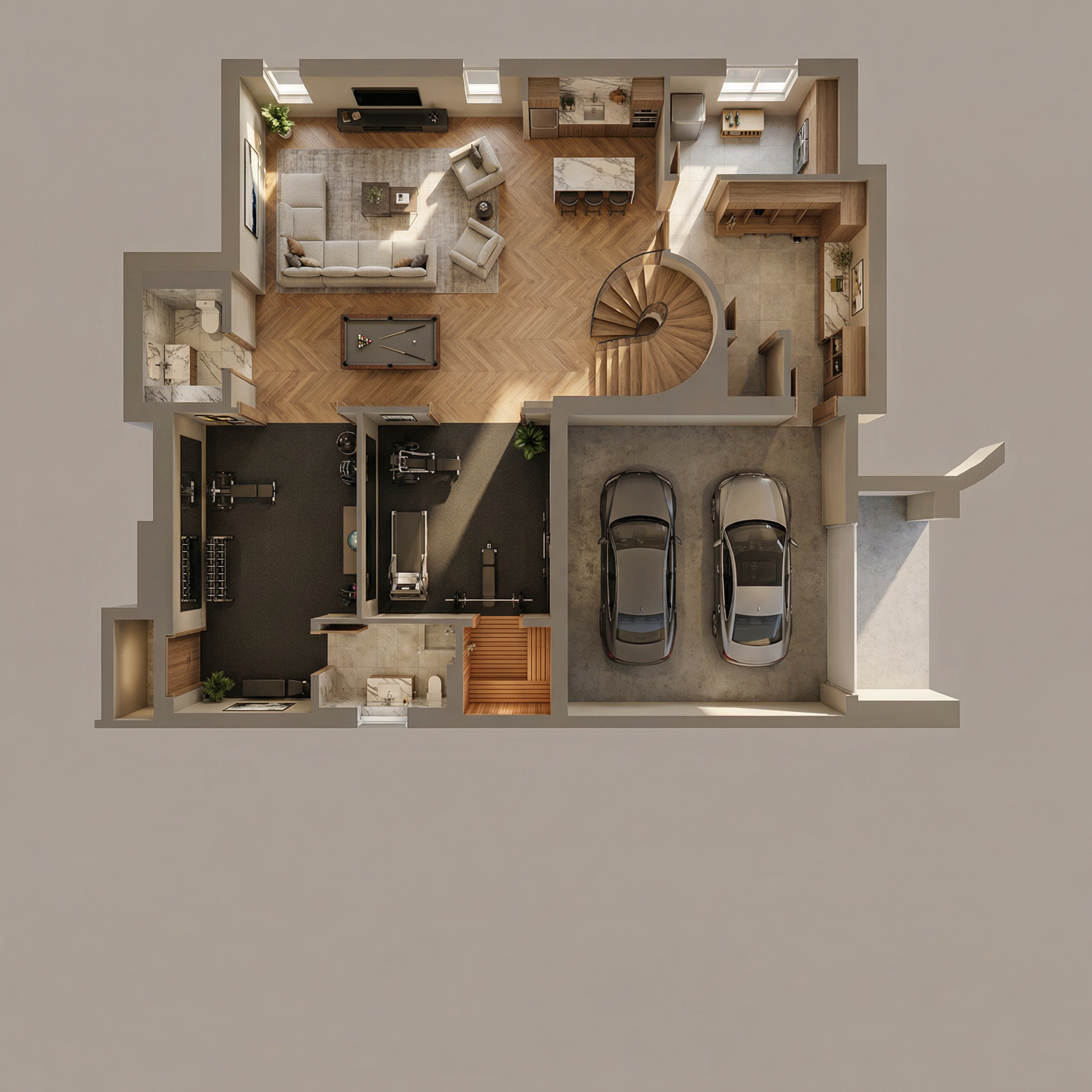take this bastment floorplan and make a 3d floorplan that is luxurious warm and layered with texture