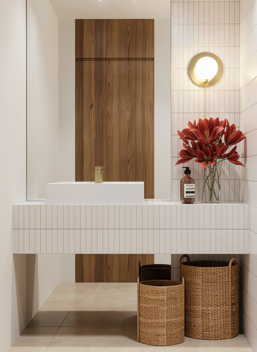 1 overall aesthetic layout the bathroom should have a balanced contemporary traditional feel the layout will follow the provided line drawing creating a dedicated vanity zone and a toilet zone the color palette is composed of soft pinks warm brass gold metals cool blue grey florals and creamy marbles 2 walls and surfaces main accent wall behind vanity toilet the focal point wall must be completely covered in the designers guild peony 2 pdg1094 02 floral peony wallpaper the pattern features large delicate cream peach and washed grey toned peony blooms on a creamy white background the rendering should capture a realistic matte paper texture other walls to keep the space bright use a soft complementary off white or cream paint inspired by the wallpaper background for any non accent walls ceiling trim clean white for the ceiling and trim crown molding baseboards to define the space and make the other colors pop 3 the vanity zone custom cabinetry dogwood pink this is a critical color match the entire cabinetry unit as detailed in the line drawing must be a custom dogwood pink a soft muted dusty rose or mauve pink it should have a high quality matte lacquered finish cabinet details follow line drawing the tower on the left feature a stacked unit with glass front cabinet doors clear or slightly reeded glass with three interior shelves the drawers below the glass doors include a stack of three flat panel drawers the main vanity centered under the mirror include a two door cabinet with a single pull the right side niche an open shelving unit to the far right matching the line drawing cabinet hardware small elegant knurled or minimalist pulls knobs in a satin gold or brass finish countertop a clean creamy white or lightly veined marble countertop perhaps calcatta gold with a square or eased edge sink faucet an undermount sink e g kohler verticyl paired with a contemporary style wall mounted gold or brass faucet with cross handles vanity backsplash use the same calcutta gold countertop 4 tall right below the wall faucet mirror a large 40 inch led backlit half circular mirror the mirror itself should be thin and minimal with a soft warm led halo light reflecting off the wallpaper 4 lighting pendants gold glass two cylindrical gold and glass led pendants must be suspended to the right of the circular mirror positioned according to the floor plan one slightly lower than the other the glass should be clean and clear and the brass elements should have a satin finish 5 the toilet zone smart toilet a high end contemporary smart toilet e g toto neorest or kohler veil details the toilet must have a clean tankless design and feature the specified elongated heated seat for the 3d render include a subtle blue led nightlight accent 6 flooring tile pattern the chevron calcatta rosa marble tile appearance the marble has creamy white and grey veining with unique warm rose pink or coral rosa veining throughout it is installed in a precise chevron pattern across the entire floor finish a polished or honed finish with thin color matched grout 7 dressing and styling vanity tower style the open glass shelves with beautiful white towels e g organic cotton small apothecary jars filled with cotton balls and bath salts and perhaps a stack of curated soaps countertop add a high end hand soap dispenser a small stack of face towels and a single stem or a small bouquet of pale pink roses or white hydrangeas to complement the floral wallpaper accessories add a plush plush bath mat near the shower tub area and a subtle designer fragrance diffuser