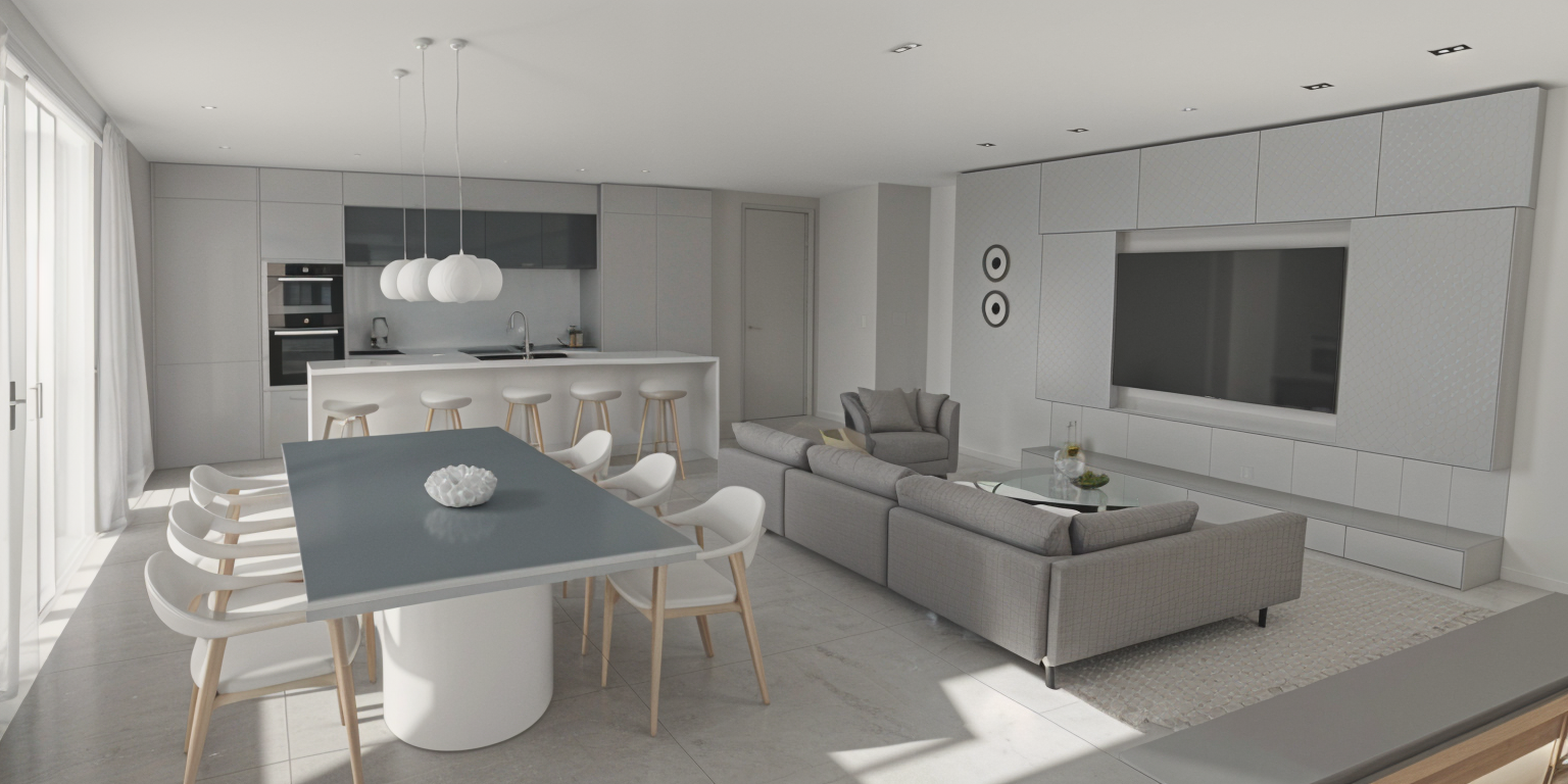 make it more photo realisti but some tableware on the table like dinner plates wine glasses bottle and make it look like a nice dinner setting not to formal though put som bottles of oil salt and pepper shakers on the kitchen island the whole back wall should be in copper as well as the kitchen fan the cieling should be the same green color as the cornice make the kitchen area a bit more lit up as daytime please even more please the wall in the back of the kitchen should be copper like tha kitchen fan but not so shiny but keep the picture bright as it is