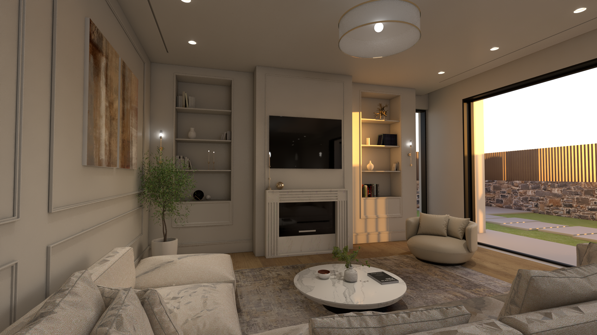 just more realistic with a little more light without change the materials the textures or the furnitures a little more light in the left side next to the tv make a texture surface in ceil light make the lights remove the light of the wall furnityre that you get in and make the inveroment more lightly and make the quality on the ceil to be more clean and show more the marble in fireplace show the lighta that i have on the walls and the marble more in fireplace under the tv remove the led lines into to the wall furniture and the marble that you get in the right side of the wall furniture open the lights that i have the wall light and the marble texture in the fire place remove only the led line