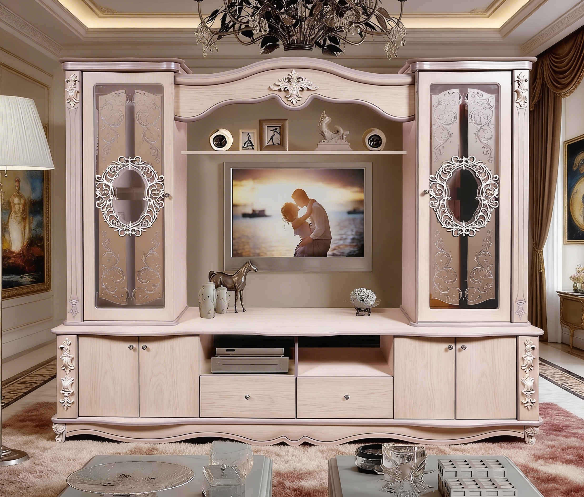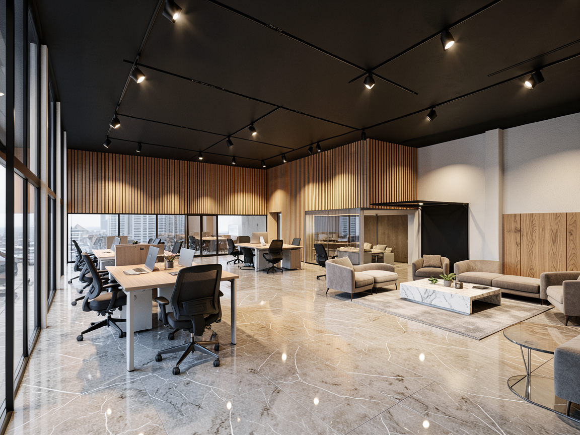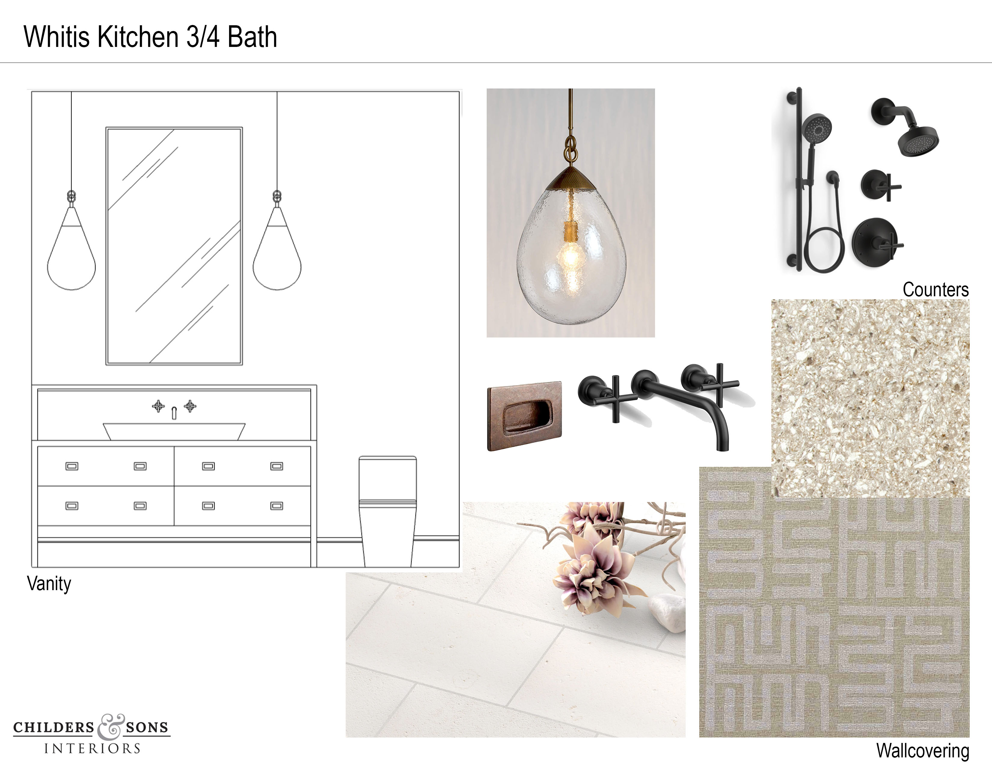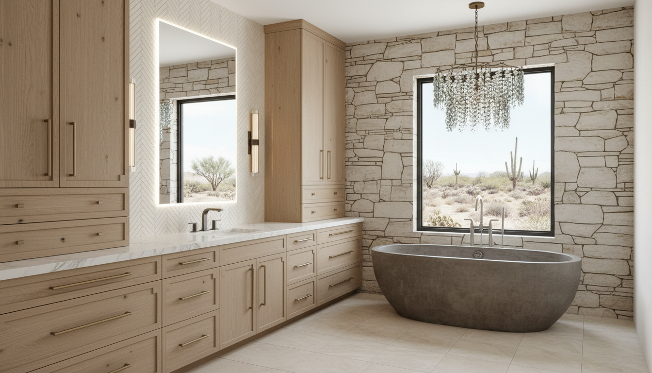 no shower french oak cabinets black window elevation view only desert with some trees out the window limestone fieldstone wall mirror backlit and frontlit