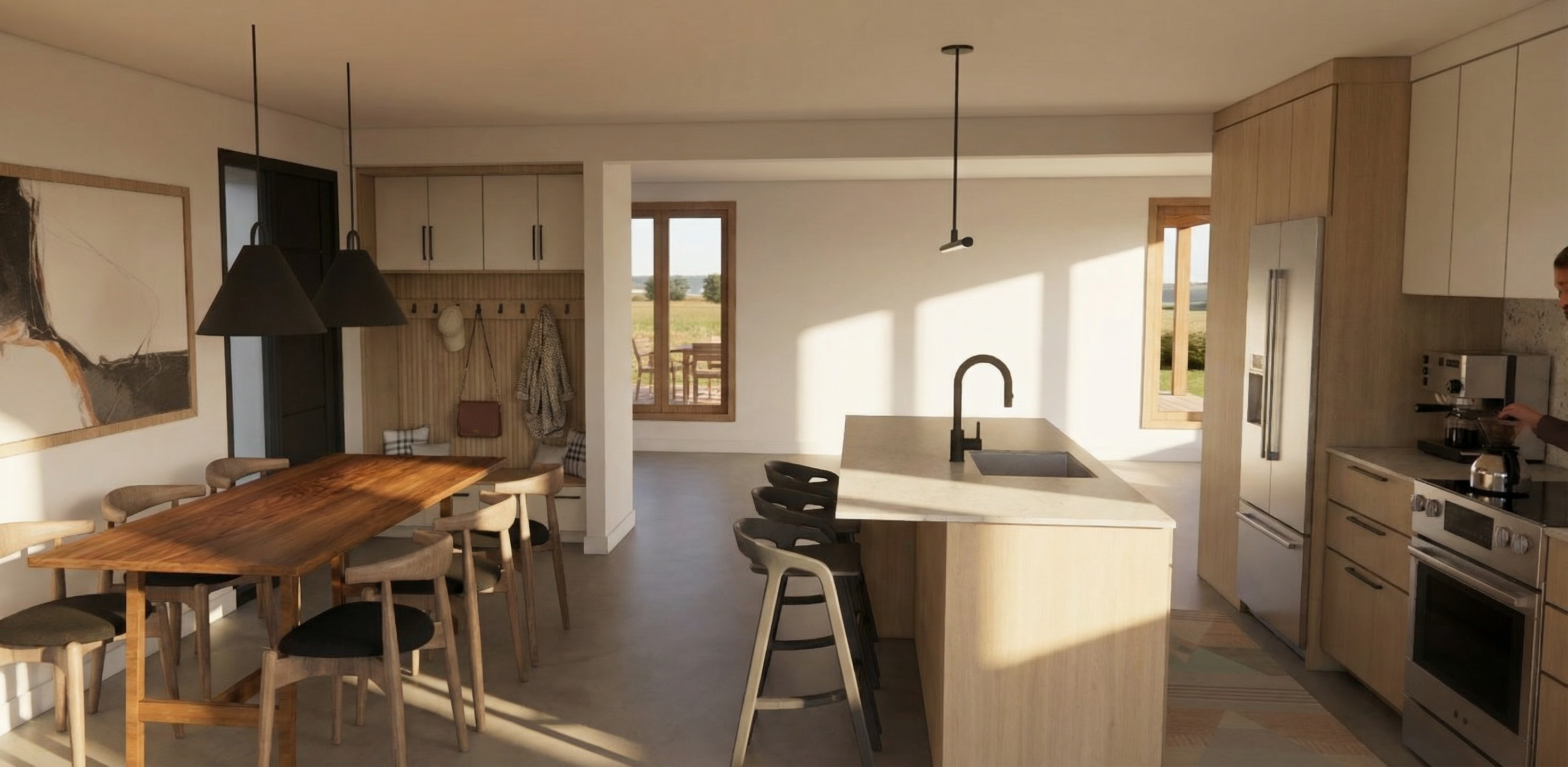 high quality photo realistic of a beautiful sunny day with blue sky luxury tropical suburban landscape located in florida with beautiful bushes in the grass area silver metal roof smooth white walls with white siding accents white framed windows this is a luxury west indies style house with a dark brown garage door front door also to be dark brown with glass the balcony railing to be dark brown and the architectural brackets in dark brown modify the garage to have 4 glass panels in row and column do not change the geometry