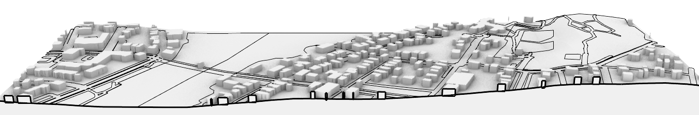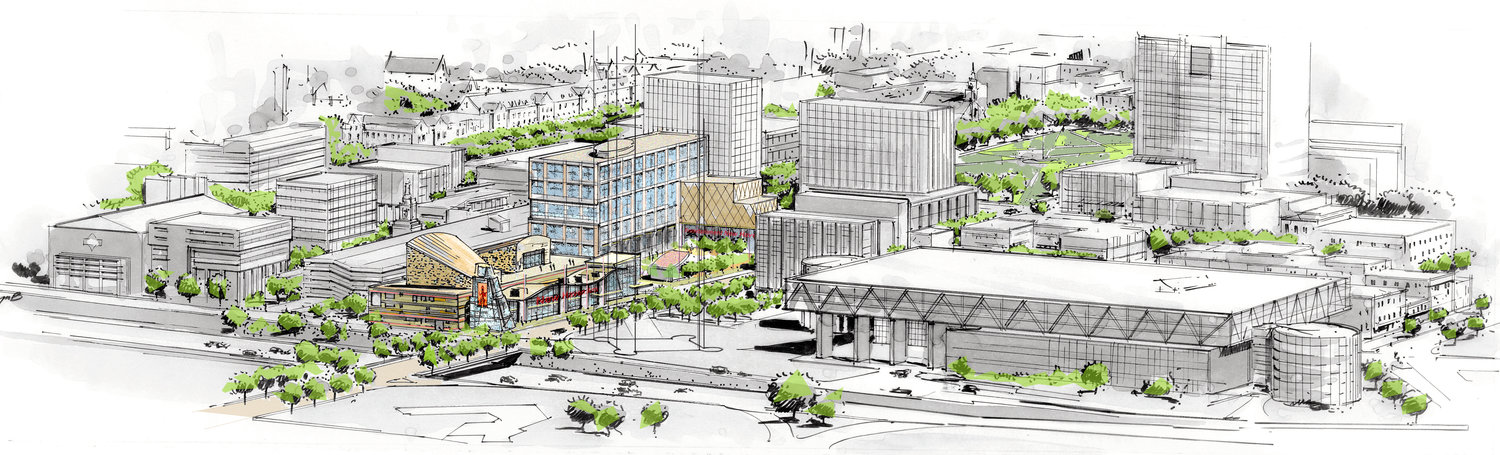 exterior shot architectural urban transect illustration hand drawn ink linework with loose sketch quality soft watercolor washes atmospheric depth layered city fabric trees rendered as loose green strokes light tonal shading architectural competition diagram style minimal color palette emphasis on spatial layers and sectional depth subtle shadows white background delicate urban sketch rendering professional architectural visualization style similar to david macaulay and contemporary urban competition boards