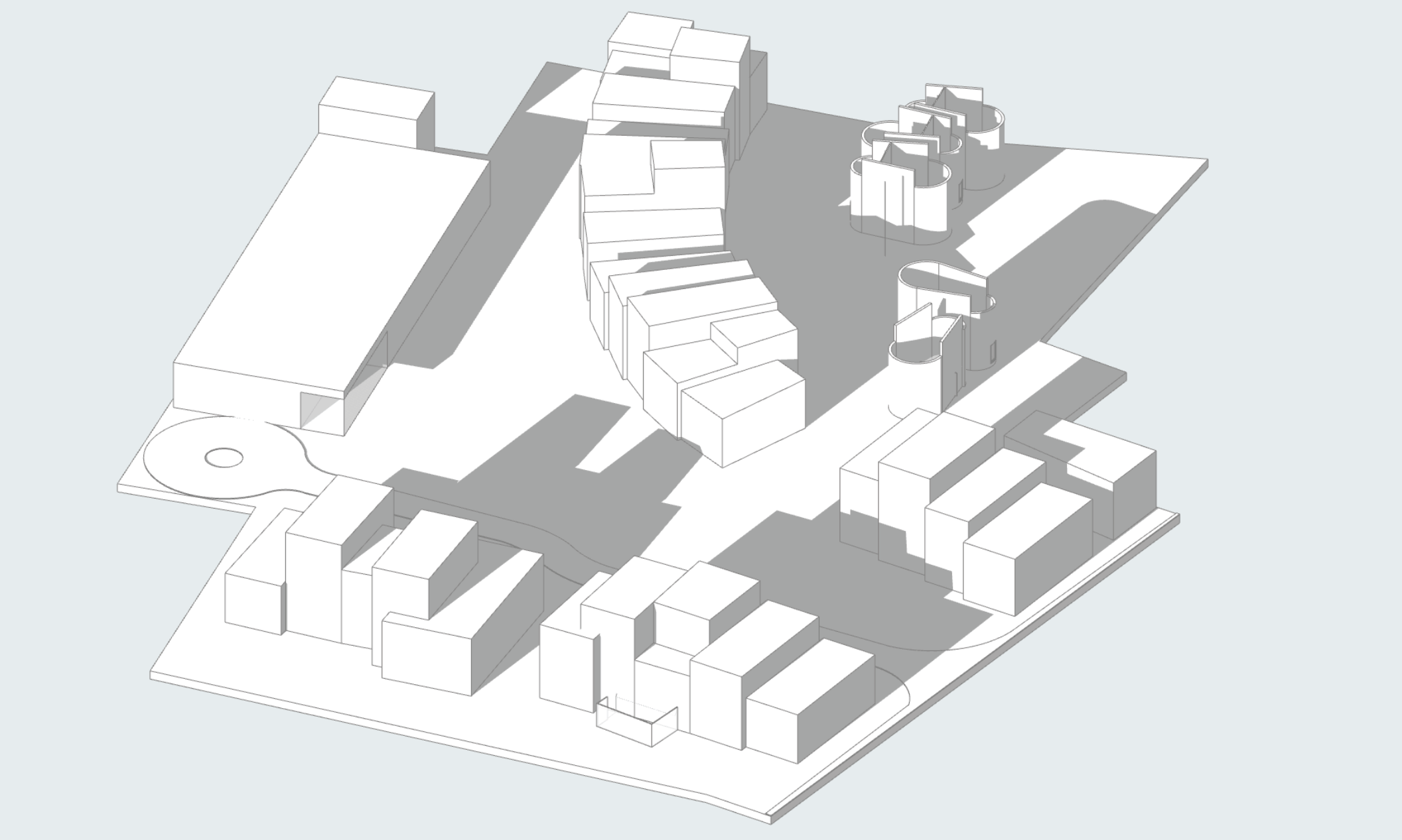 aerial shot a modern architectural site plan with minimalistic buildings in a serene urban environment buildings feature sleek contemporary lines with a white facade the ground is a soft light grey concrete shadows in a subtle cool grey create a dynamic contrast surroundings include lush greenery with vibrant green landscaping the atmosphere is calm and peaceful with a clear blue sky