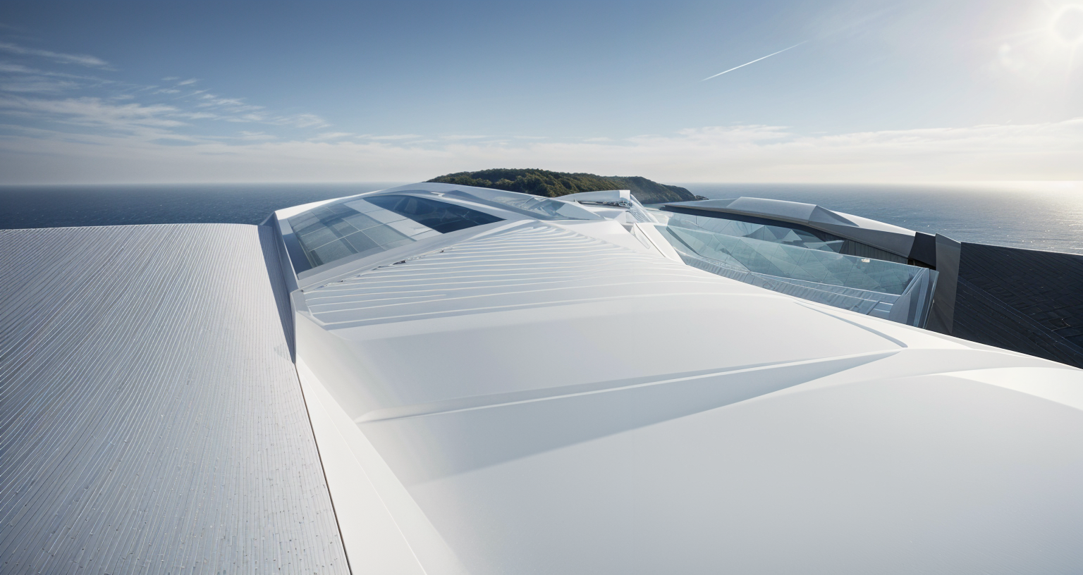 render a beautiful suburban house with a mountain modern design with rustic accents the house features white vertical siding and accents of natural stone on the columns the roof is onyx black with a mix a shingled texture black metal roof two wooden garage doors in a warm brown shade complement the crisp white exterior the front fa ade has a grand entrance with tall windows framed with black the lush green lawn is well manicured bordered with small bushes and shrubs in various green tones the sky above is bright and clear blue creating a calm and welcoming atmosphere