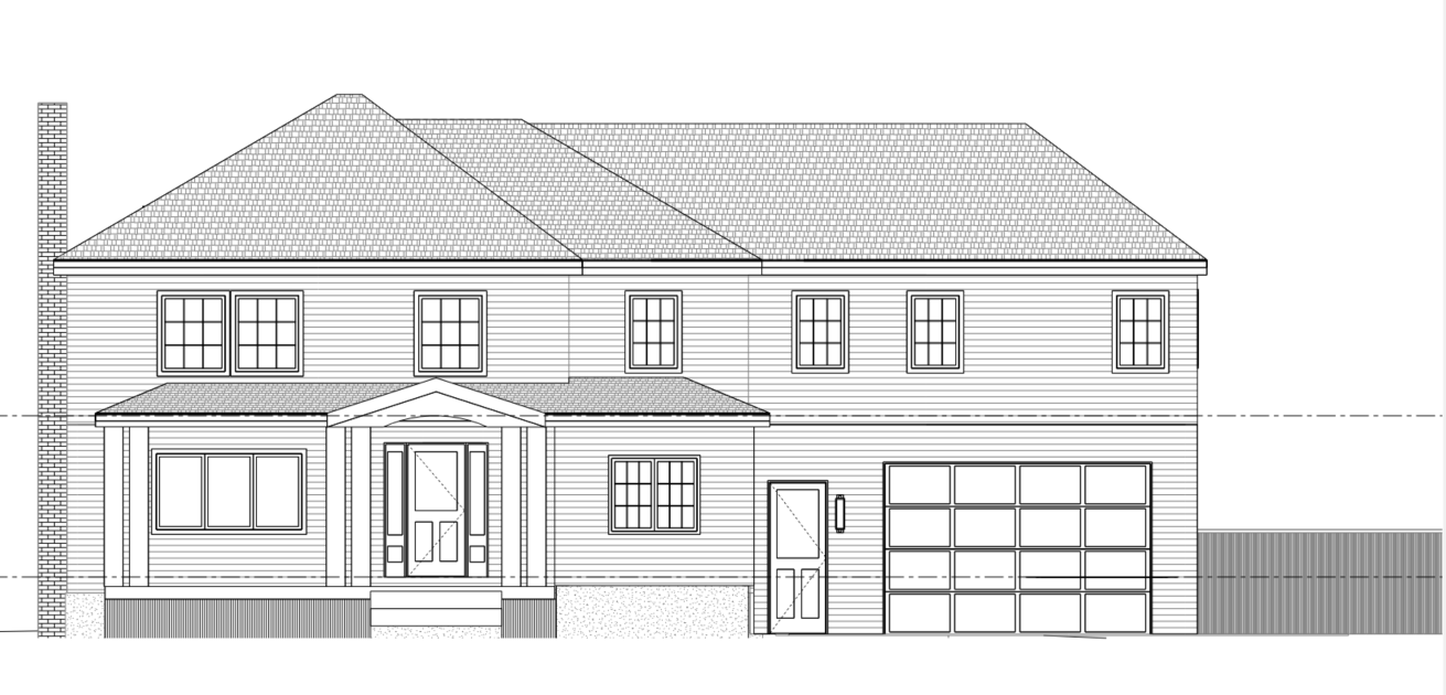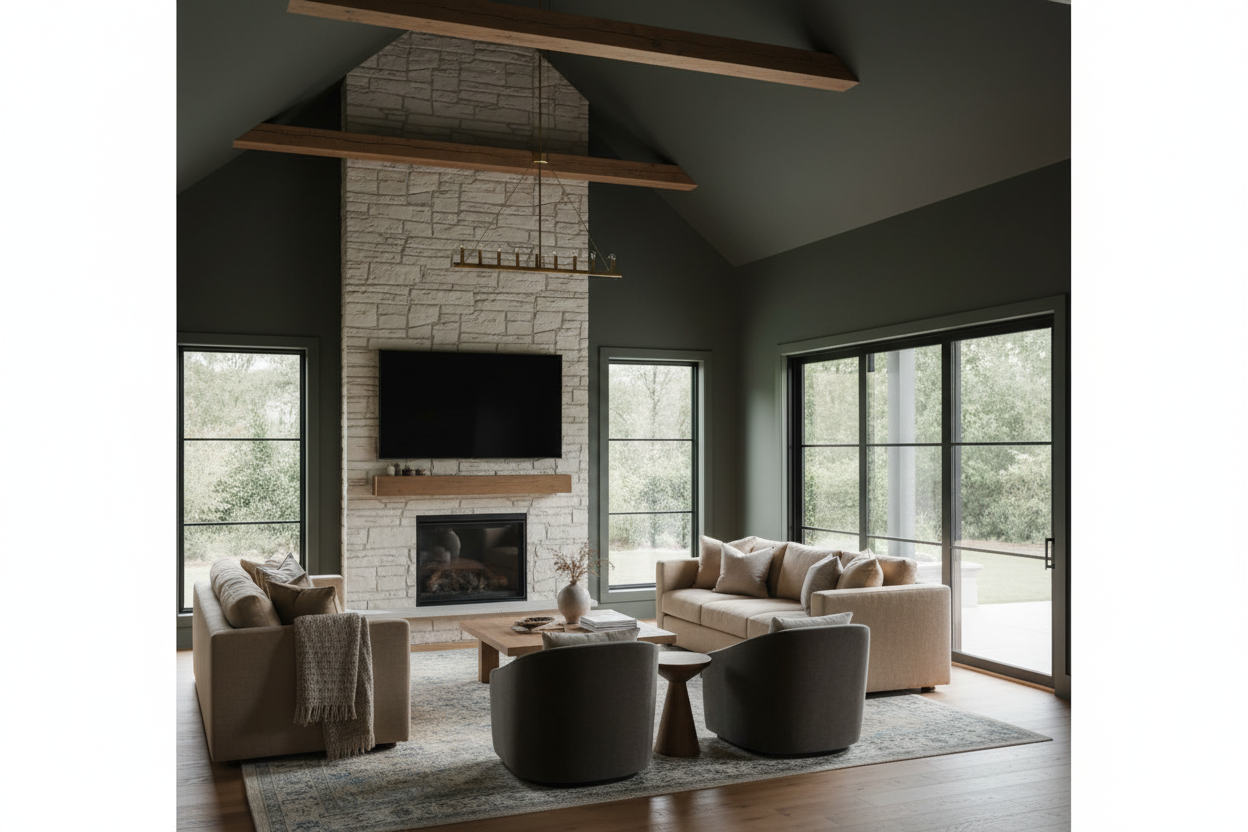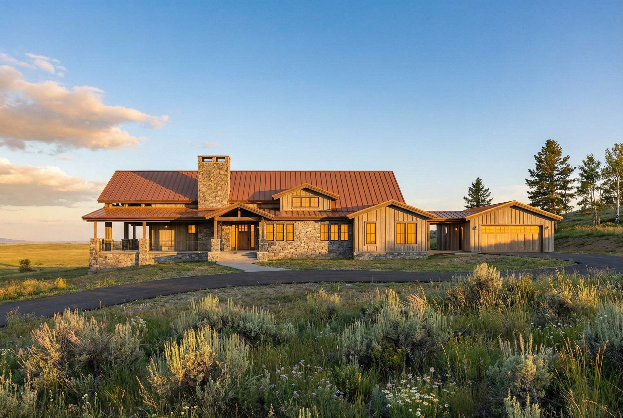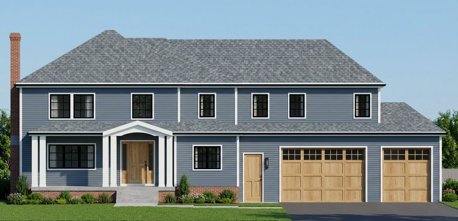 blue grey siding with white trim windows to have black mullions show doors as natural white oak dark slate grey roof keep elevation unchanged