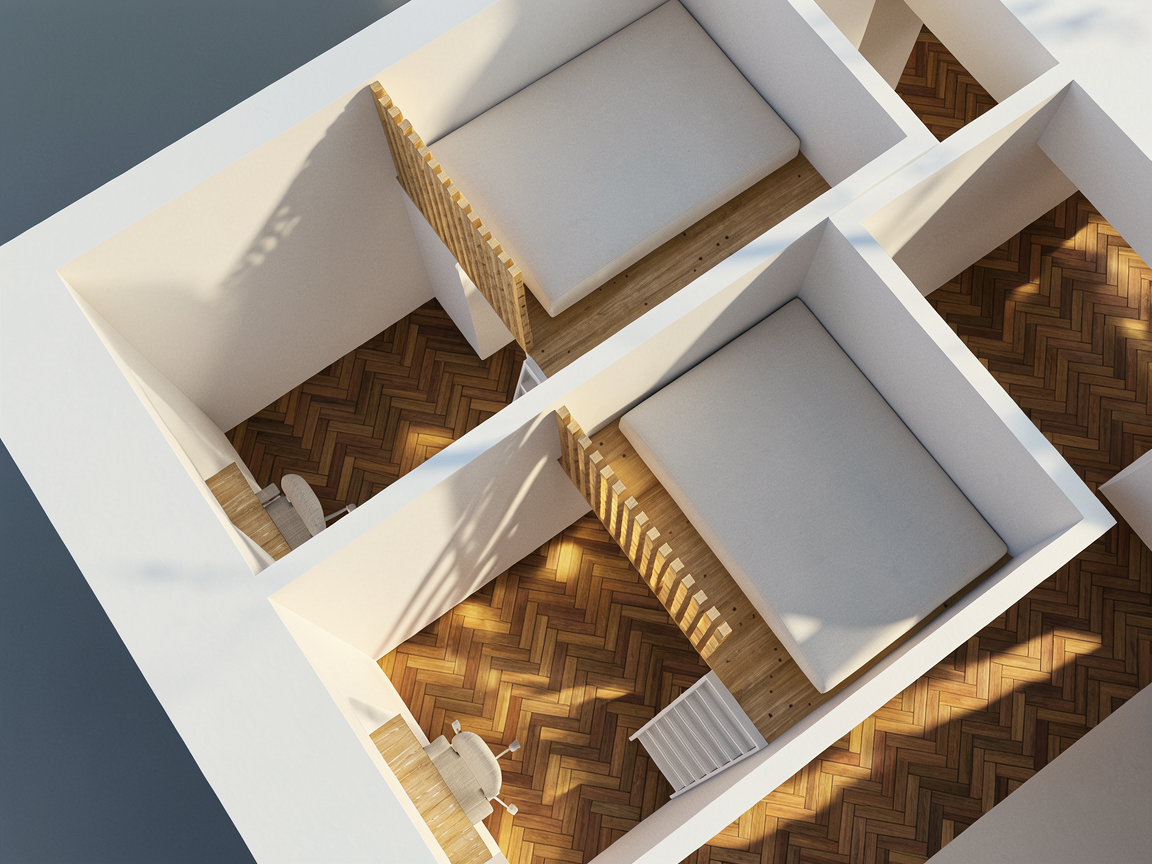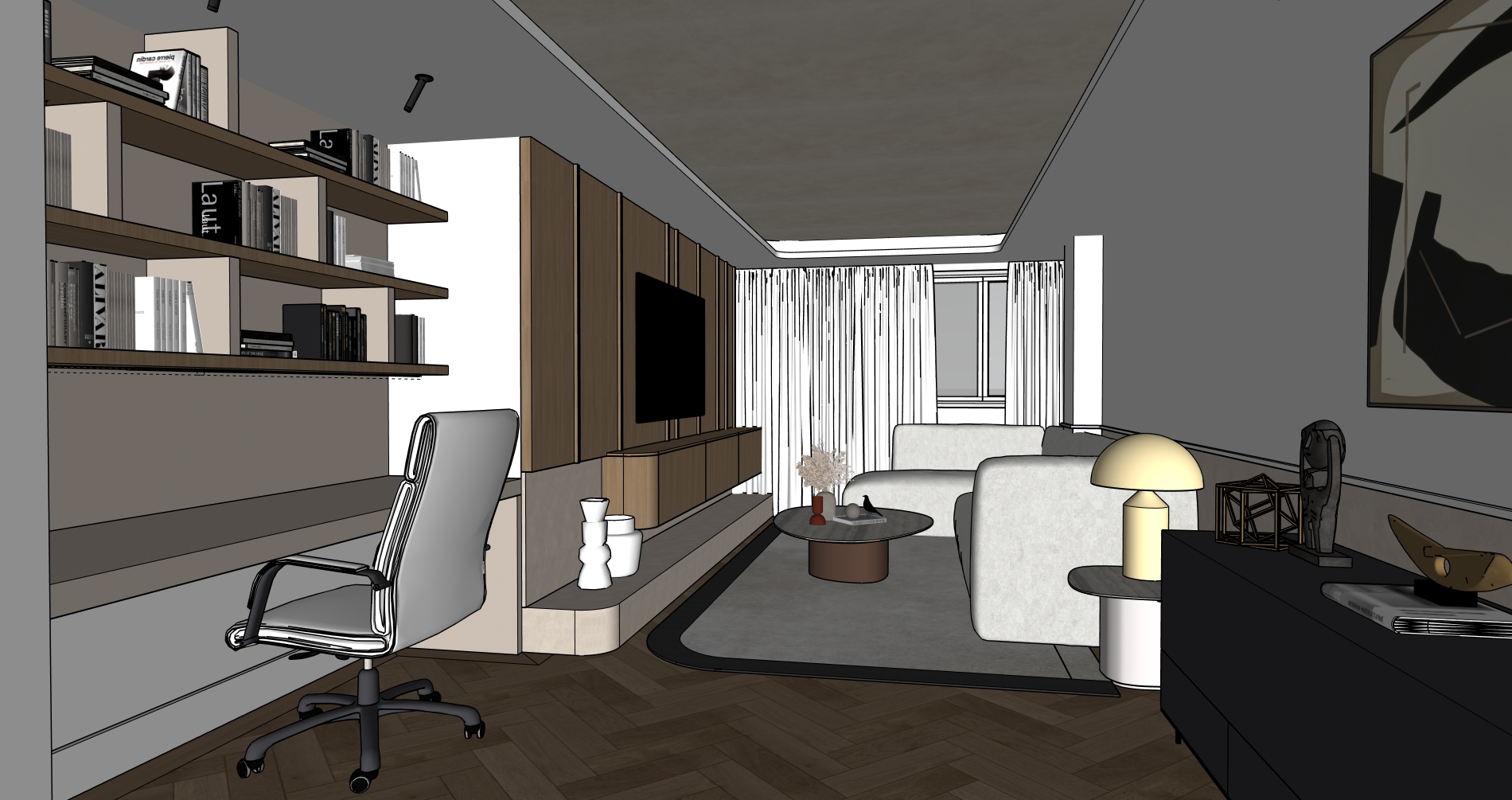 crea una imagen fotorealista a partir de esta de sketchup realza las texturas e iluminacion para que queda todo natural y realista