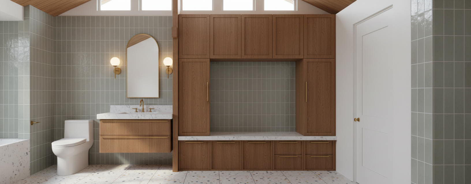 make this photo more realistic keep the blue tile backsplash in 4x4 tile and honed travertine tile floor add some cylindrical shaped wall sconces in a glass and satin nickel finish with light pointing towards the ceiling add in part of a shower in front of the toilet towards the southern wall most of it will be cut off do not add the toilet into the shower the shower can only be about 36 inches deep so you can still get to the toilet add some neutral patterned towels into the linen closet and onto the towel bar as well as some hooks above it use a light oak wood do not change any geometry update the towel bar to a more modern style in satin nickel finish use the same honed travertine goes on the floor and walls and countertop add some toiletries like soap and shampoo into the linen closet add a shower stall next to the toilet the southern wall of the bathroom