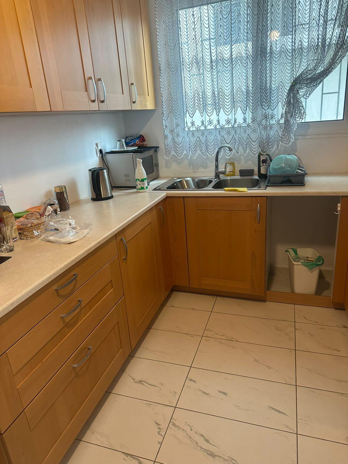 install large format greige tiles gray beige 60x120cm matte finish on both walls between countertops and upper cabinets keep everything else identical counters cabinets appliances unchanged photorealistic match existing lighting