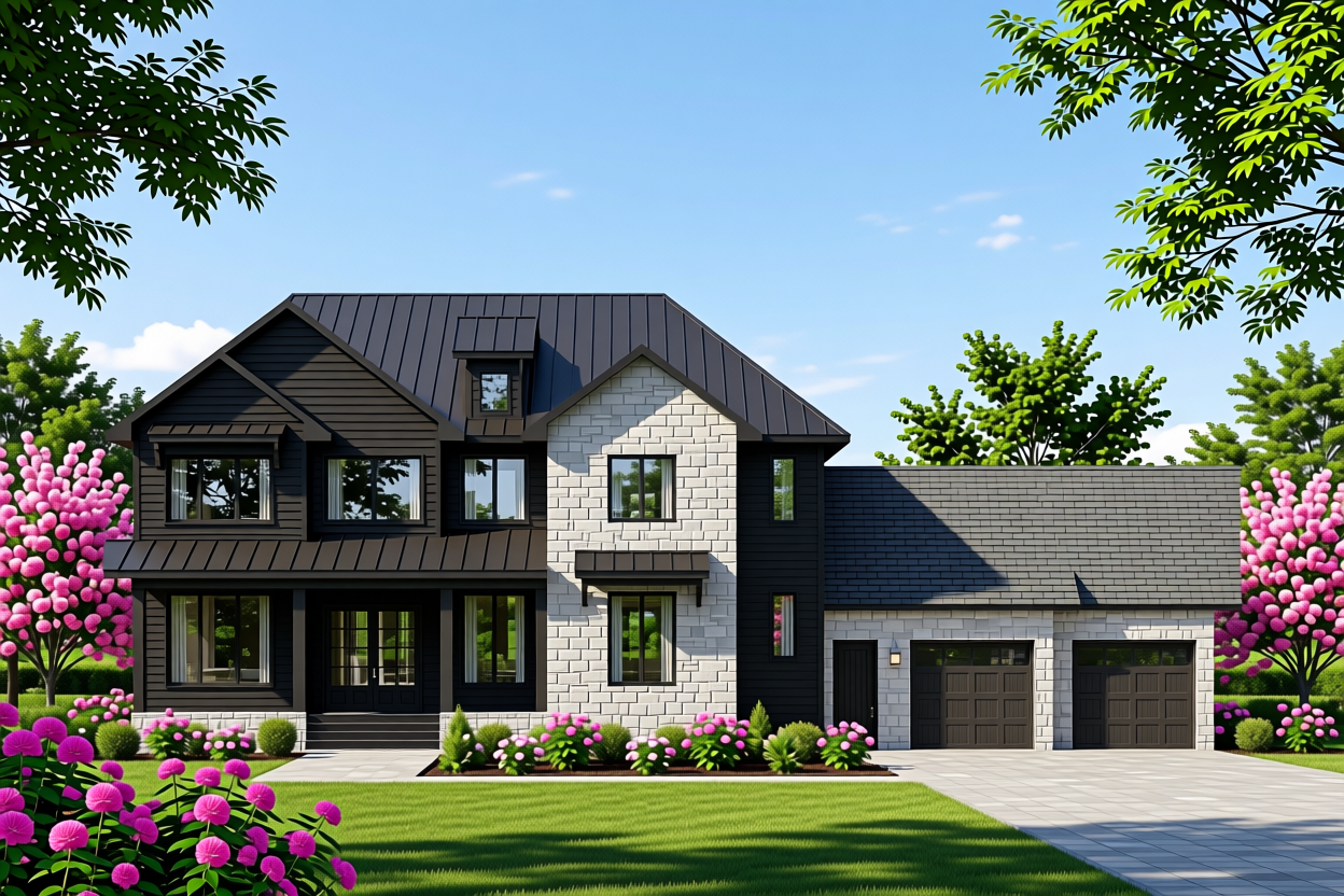 the only changes to this photo is to change the gable on the left side of the house to match the white stone gable in the middle of the house have the shingles over the garage black have the little roofline over the left garage door black metal