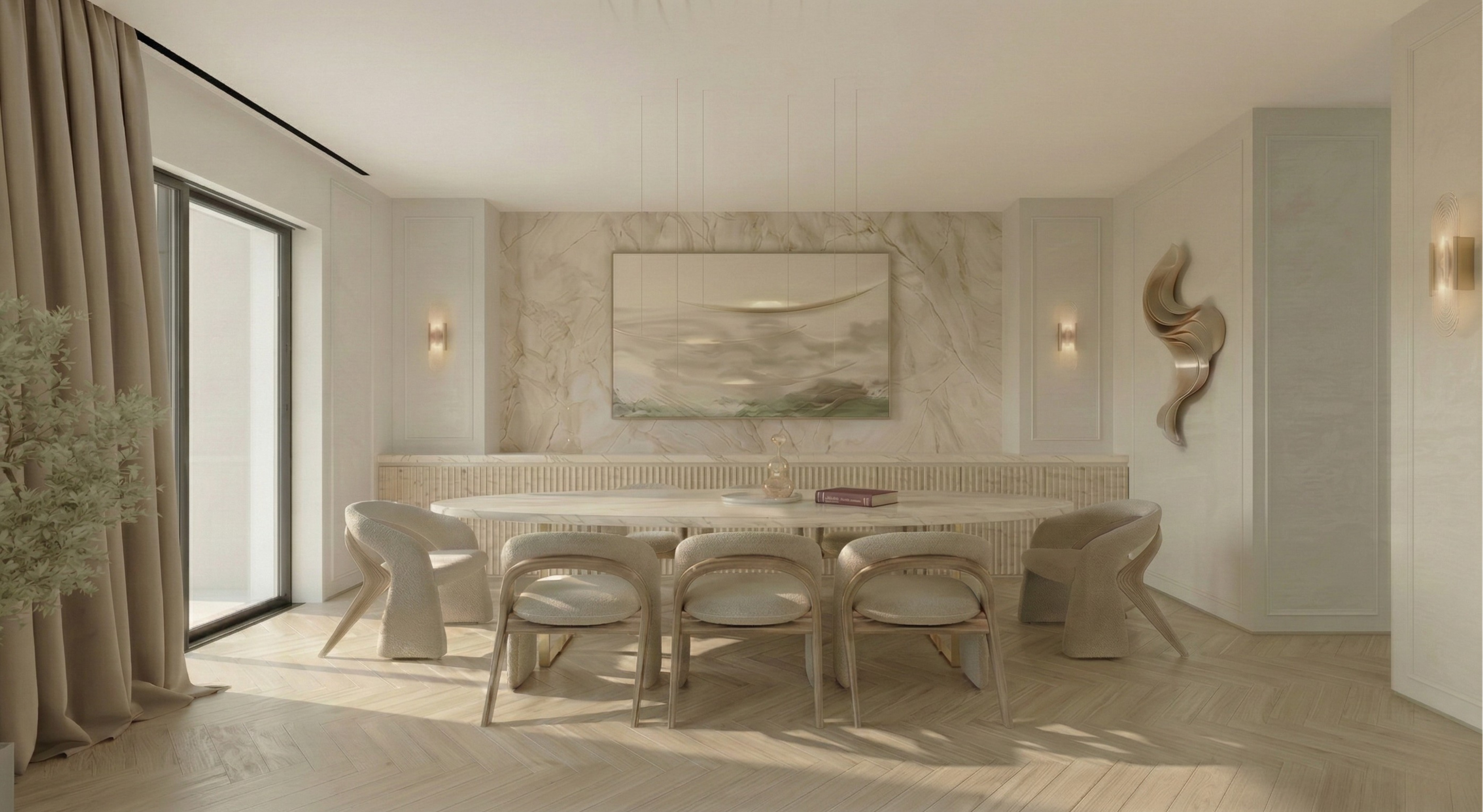 take this semi final render and enhance realism without altering any of the current image s geometry features or objects as well as image orientation no cropping zooming etc final result must be 4k do not add any new objects keep the herringbone pattern exactly as is but increase the tonal variation between individual planks each stave should have a distinct natural shade ranging from light sand to muted beige change the surface to an ultramatte raw timber texture with visible open grain removing all artificial sheen or plastic like smoothness the goal is to see a clear organic contrast in color from one tile to the next emphasizing its wooden nature yet making the effect visible yet delicate and so it doesnt stand out too much the goal is for the change from the original to be subtle as for the materials though its important to make them clear and visible we are aiming to respect the softness and elegance of the composition as a whole for that reason no exaggerated contrasts or saturations are welcomed here result must be elegant clear high res 4k for client viewing