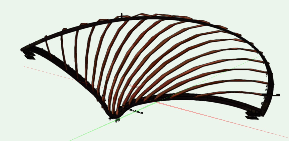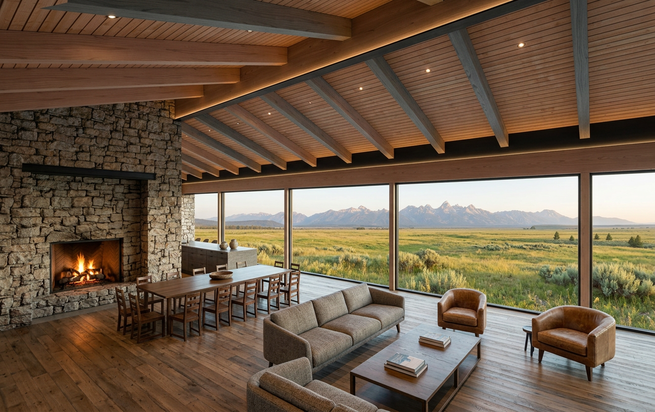 render a modern architectural scene featuring a large building with a sloped roof the roof is rich mahogany brown and the walls have an industrial gray tone with vertical lines include a light green rectangular panel on the facade and dark teal doors the surrounding ground is a blend of soft pastel blues and gray add a foreground with a sleek metallic railing set the atmosphere in a clear bright morning with a pale blue sky enhancing the modern and tranquil ambiance architecture